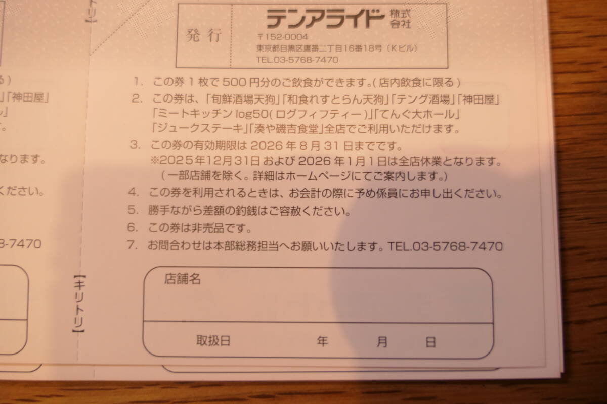 ●この券は「旬鮮酒場天狗」「旬鮮だいにんぐ天狗」「和食レストラン天狗」 「テング酒場」「てんぐ大ホール」「神田屋」等でご利用できます。