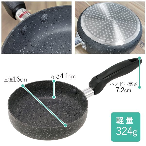 | 材質 | 表面加工/内面:ふっ素樹脂塗膜加工、外面:焼付塗装 本体/アルミニウム合金 はり底/ステンレス鋼(クロム18%) 底の厚さ/2.3mm 取手/フェノール樹脂、ABS樹脂 |