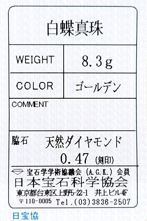 | ■白蝶真珠 | 色 : 濃いゴールデンイエローの色合い エクボ・傷 : 肉眼ではエクボや傷が見受けられない程度 形・テリ : ほぼ真円に近く、テリの綺麗な珠 |
