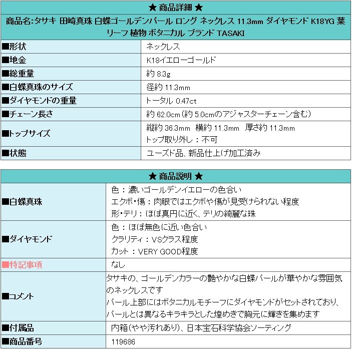 | 商品名:タサキ 田崎真珠 白蝶ゴールデンパール ロング ネックレス 11.3mm ダイヤモンド K18YG 葉 リーフ 植物 ボタニカル ブランド TASAKI | |