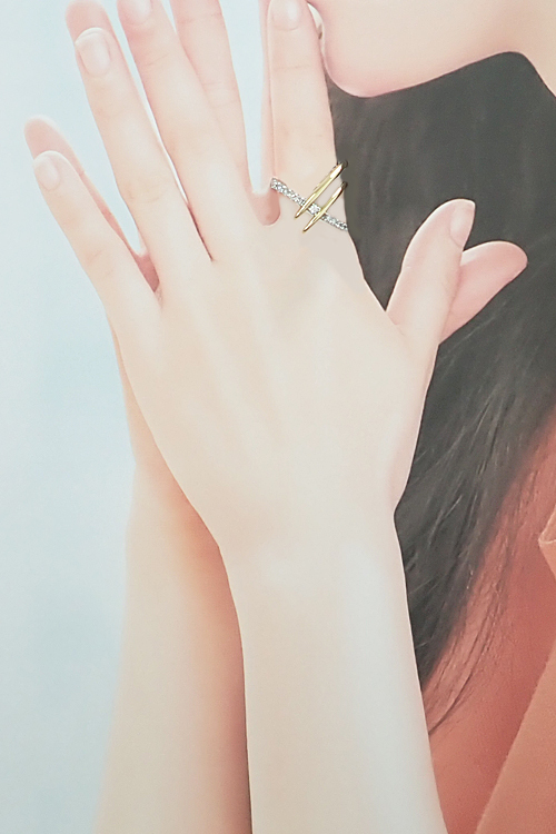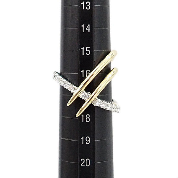 コメントカラッチの、人差し指に沿うようなスタイリッシュなデザインが魅力的な、ダイヤモンドがきらめくパイナスリングです。凛とした印象のホワイトゴールドに交差するイエローゴールドのラインがエレガントな一品です。