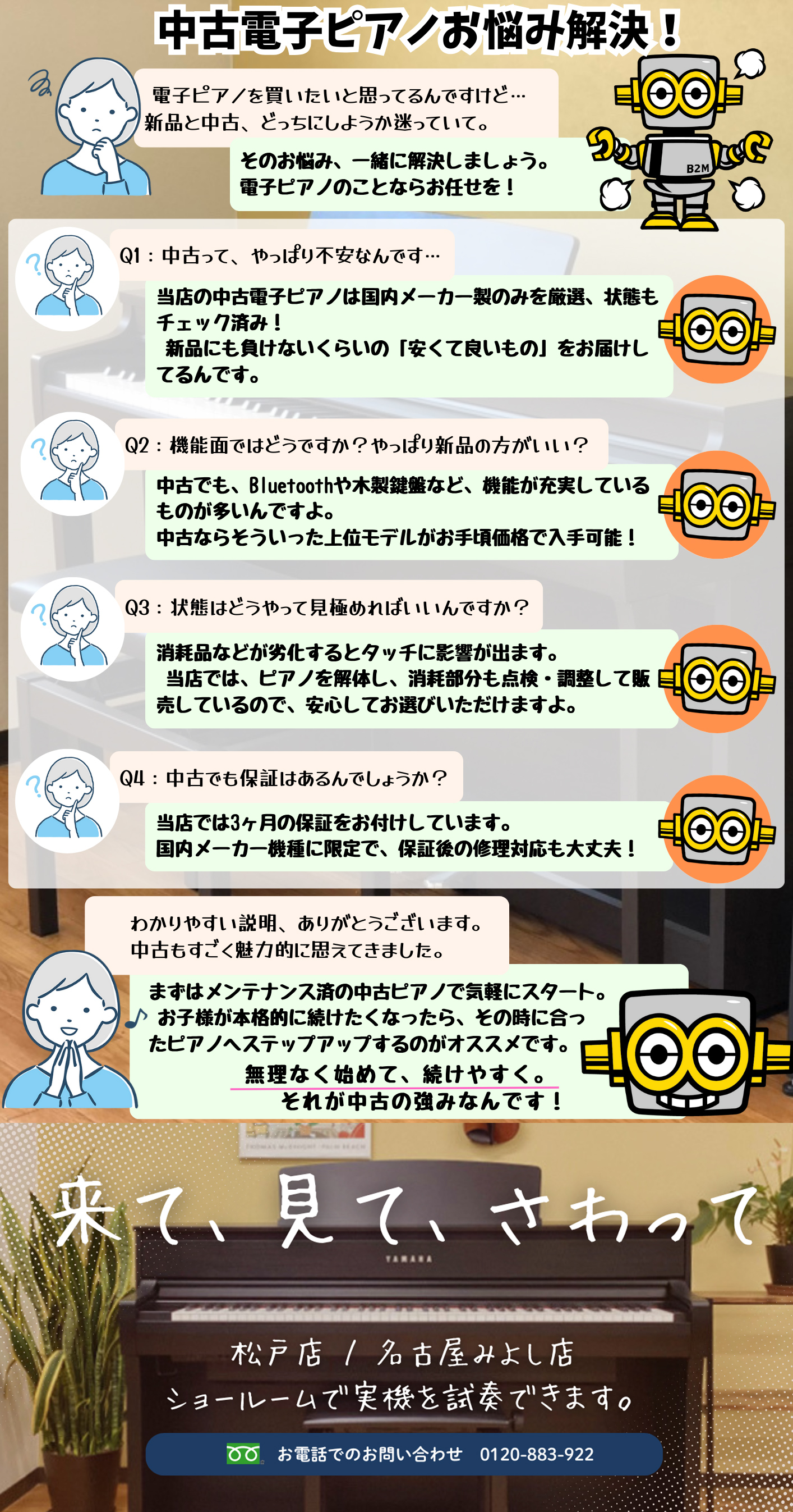 《配送設置無料/中古電子ピアノ専門店 B.B.Music 2026 電子ピアノ初心者応援セール》 お買い得な「Premium Used Digital Piano」。初めての人にも安心な価格と3ヶ月保証。 中古電子ピアノ本体ご購入特典・快適演奏グッズ(ピアノ用除菌水・新品ヘッドホンなど)をプレゼント!