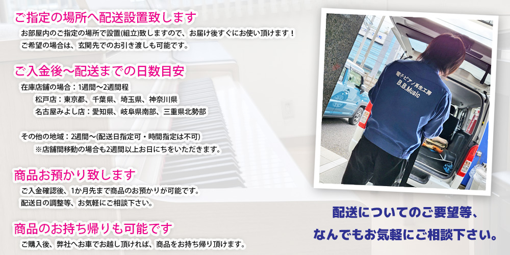 電子ピアノの配送は、《お客様のご希望日程を参考に打ち合わせのうえ決定》となります。ご希望に沿えるよう調整いたしますが、下記の目安をご確認ください。
