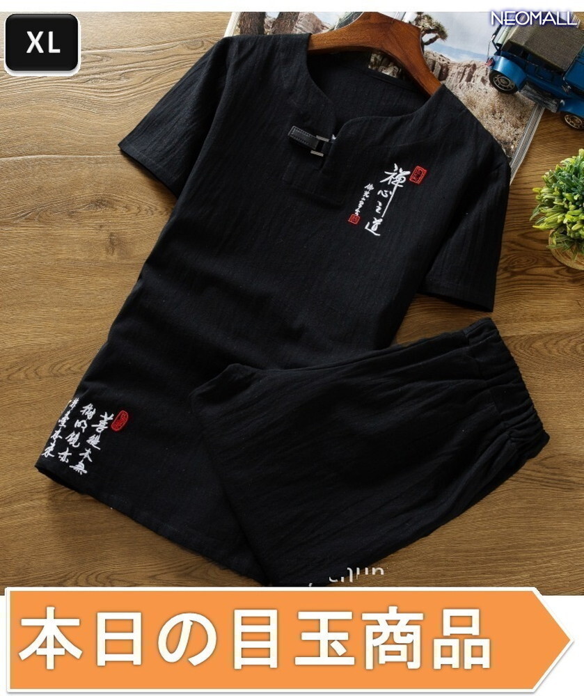 1スタ☆【299】 新品 サマーコットン ヘンリーネック セットアップ ブラック XLサイズ 春 夏 部屋着 ルームウエア