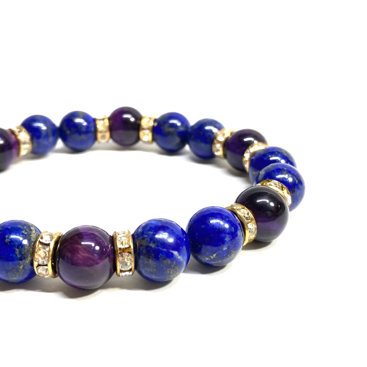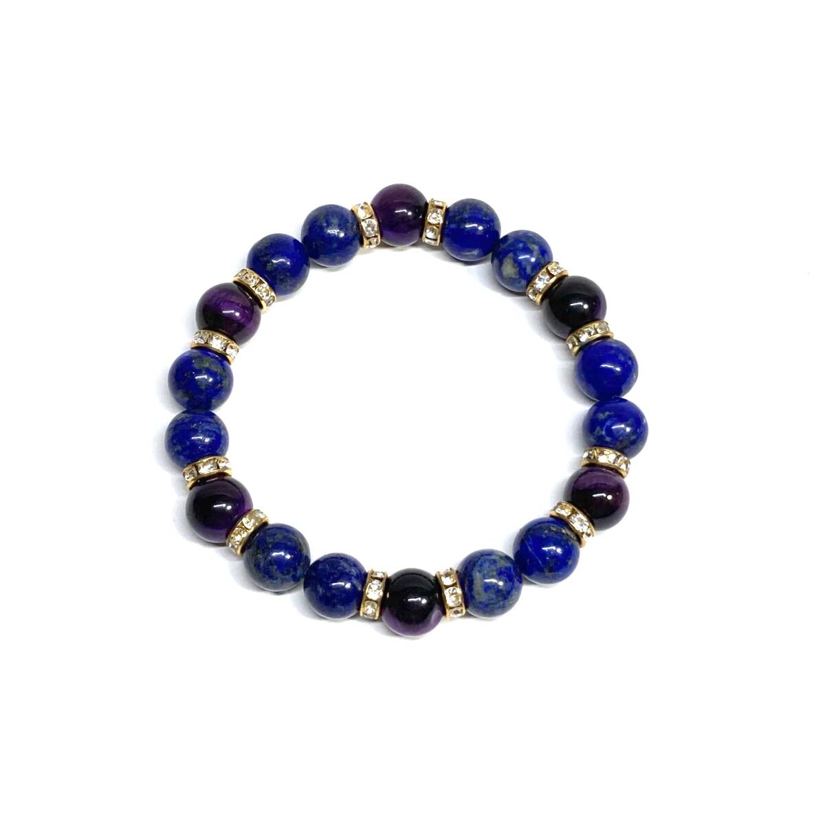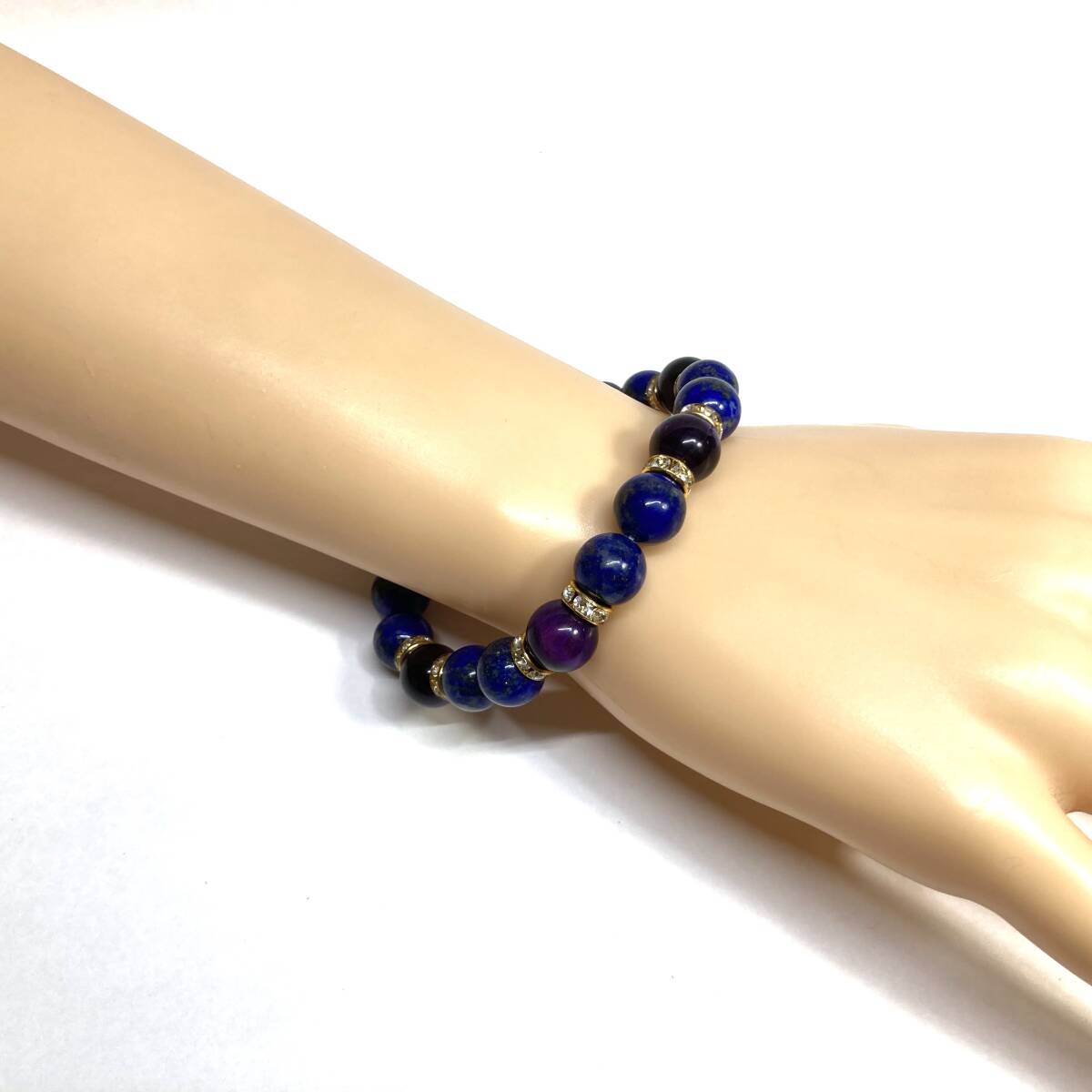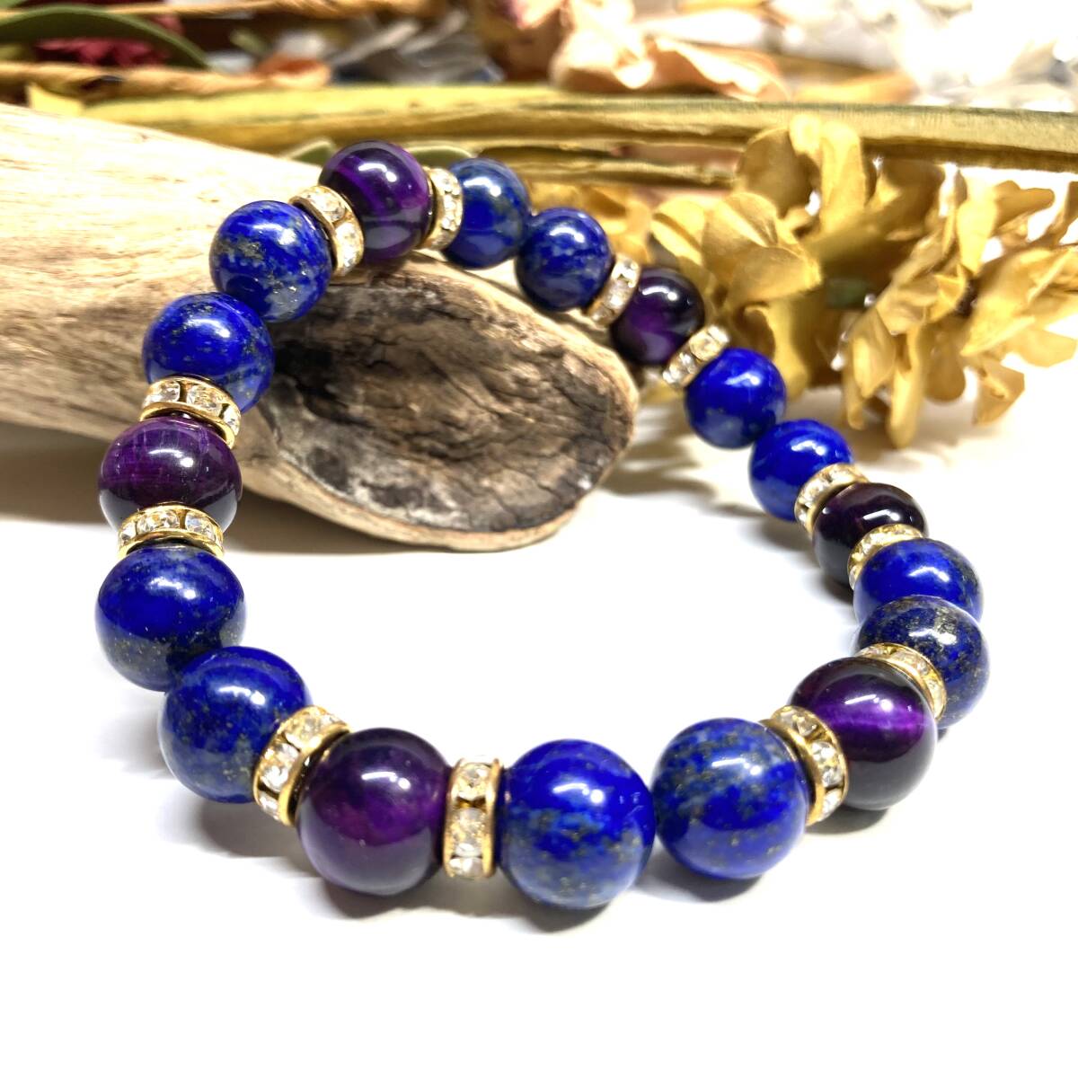 こちらは、ラピスラズリとパープル タイガーアイを組み合わせたパワーストーンブレスレットです。間にはロンデルを挟み高級感あるデザインに仕上げております。石大きさは腕にも馴染みやすいように10mm玉で内径約18cm(伸可能)です。(サイズ変更の場合は取引ナビにてご連絡をお願いします。) 数に限りがございますので気になる方はお早めにどうぞ。