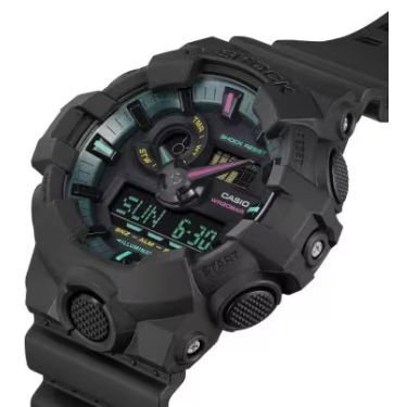 1983年の発売からあくなき強さを求めて進化を続けるタフネスウオッチG-SHOCKから、Vividなアクセントカラーが際立つMulti Fluorescent colorシリーズです。 マットブラックのベゼルとバンドに、ヴァーチャルな世界をイメージしたアクセントカラーを時分針や時字、文字板の表記に採用。 クールなマットブラックに鮮やかなカラーリングで、ファッションシーンでも幅広く活用できるデザインに仕上げました。