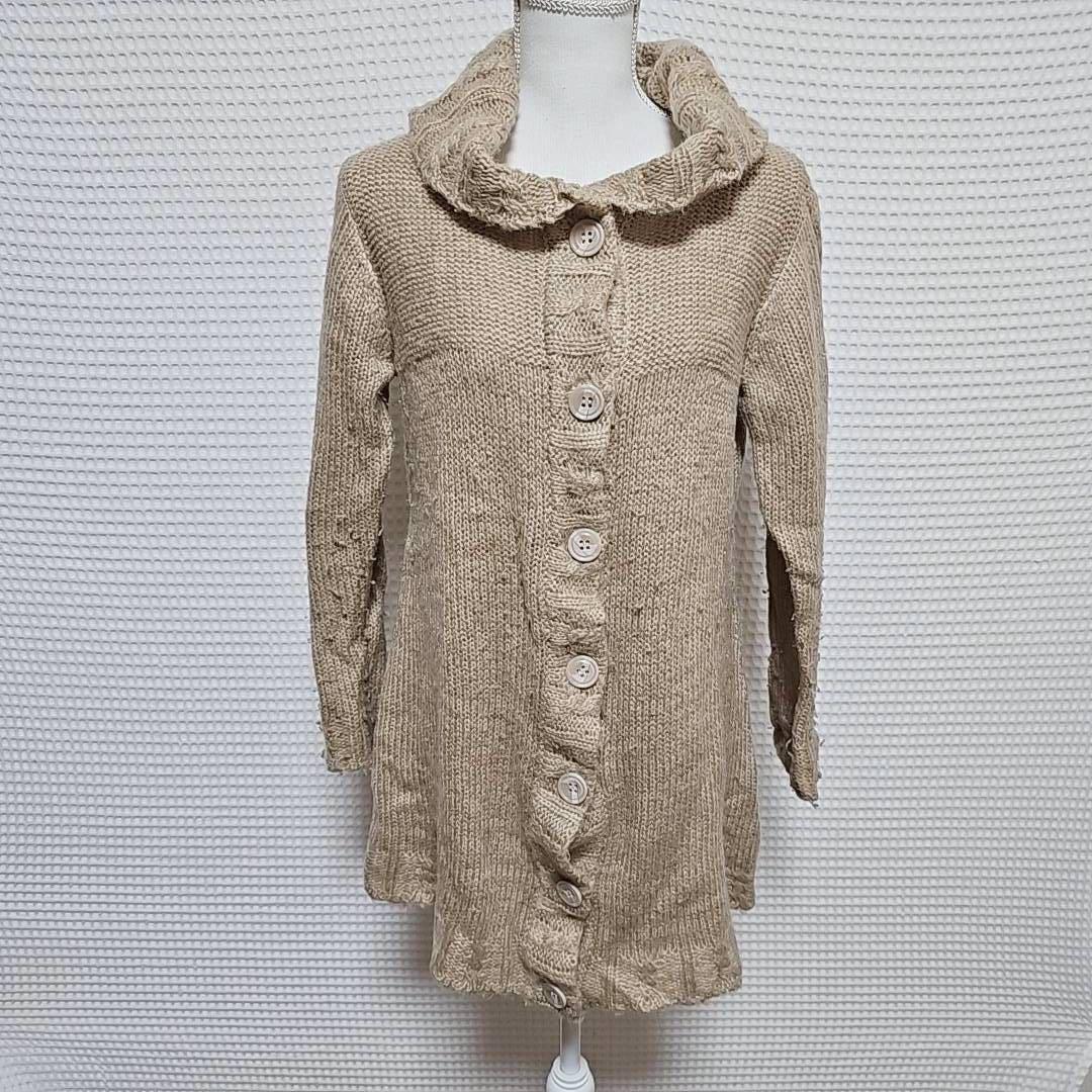 コーラルカラーのフード付きニットカーディガン、M-Lサイズ、ボタン留めデザイン。