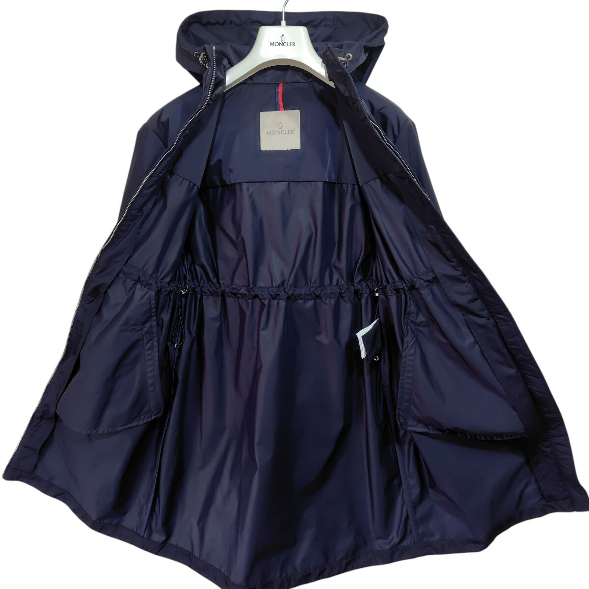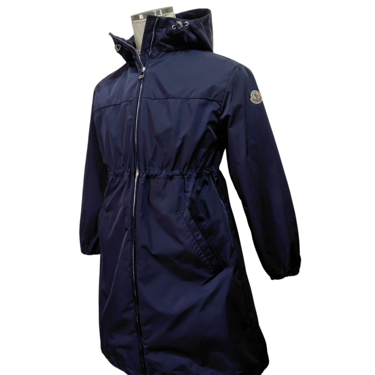スレやシワになりにくいしっかりと張りのあるポリエステル生地のフード付きスプリングコートです。