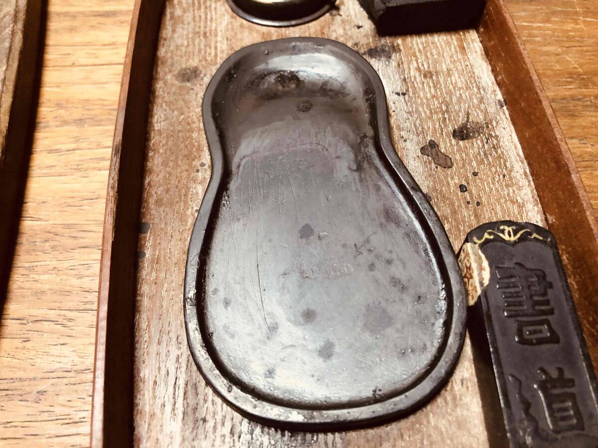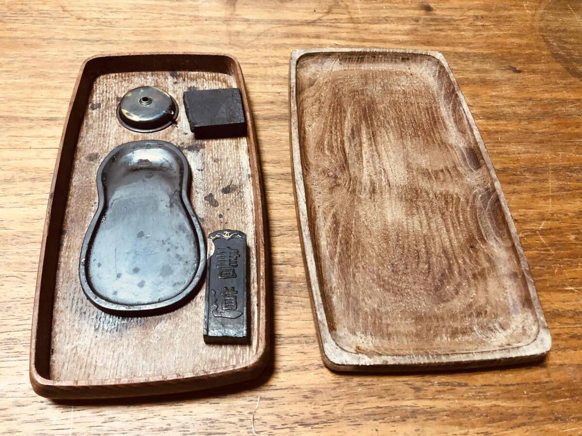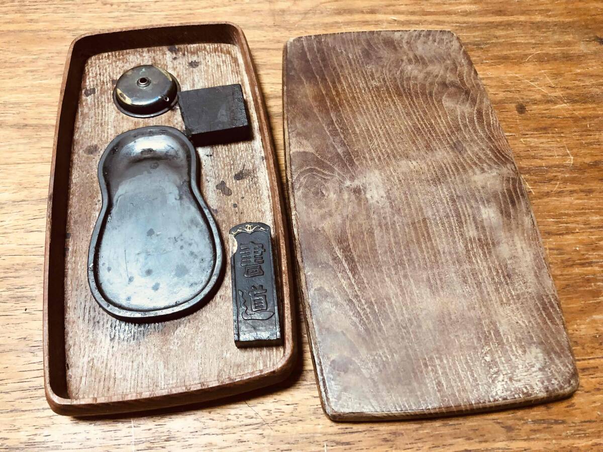 内容: 木製外箱(蓋・本体)、硯、墨、金属製の道具(水滴または墨池)