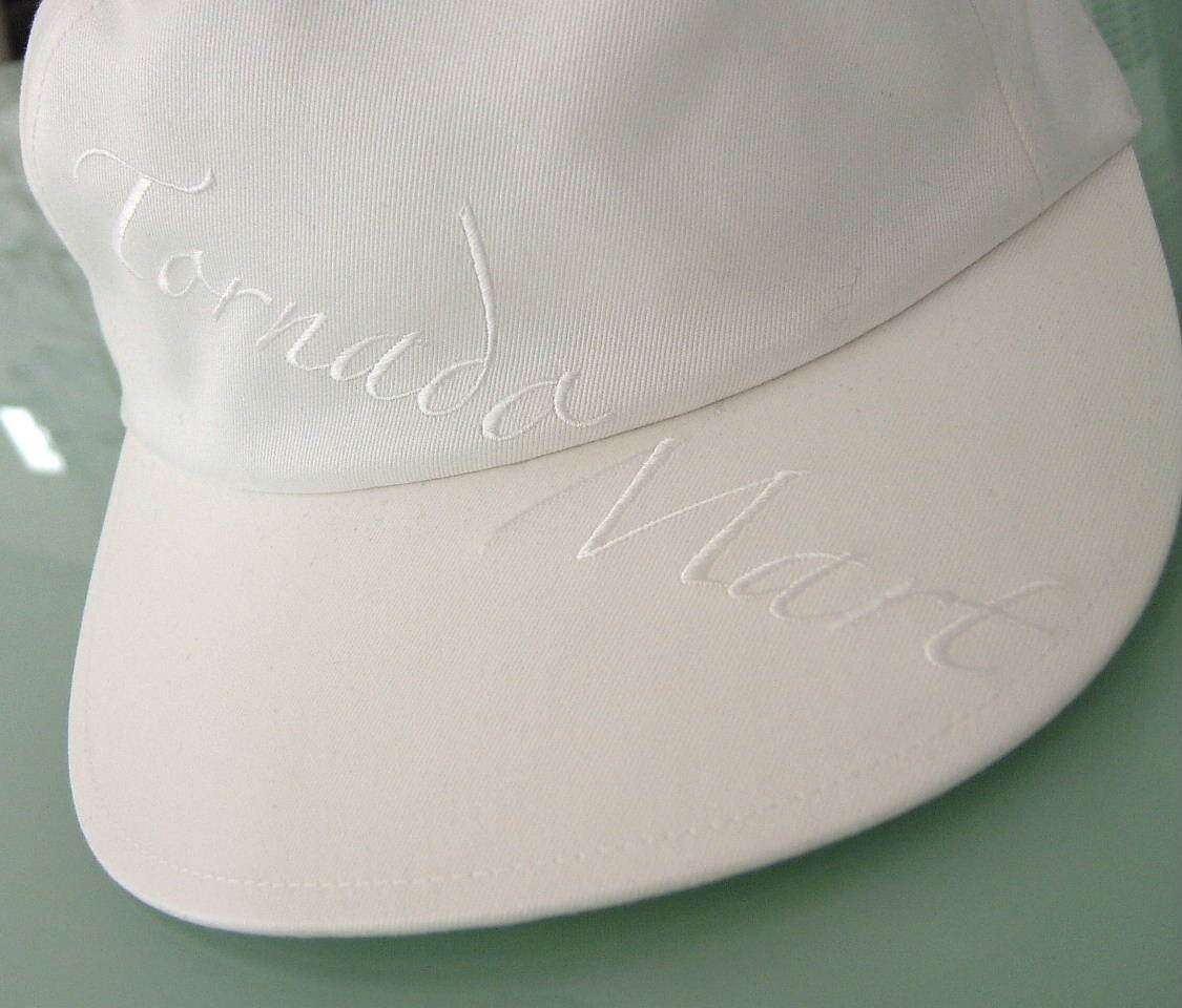 ■TORNADOMARTブランドロゴを刺繍にて筆記体でフロントに施したアポロキャップですベースと同色の白ホワイトで斜めに入れてデザインアクセントとしています ベースと同色の色で斜めにいれることでさりげなく施してあります