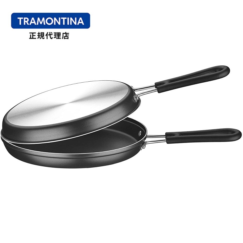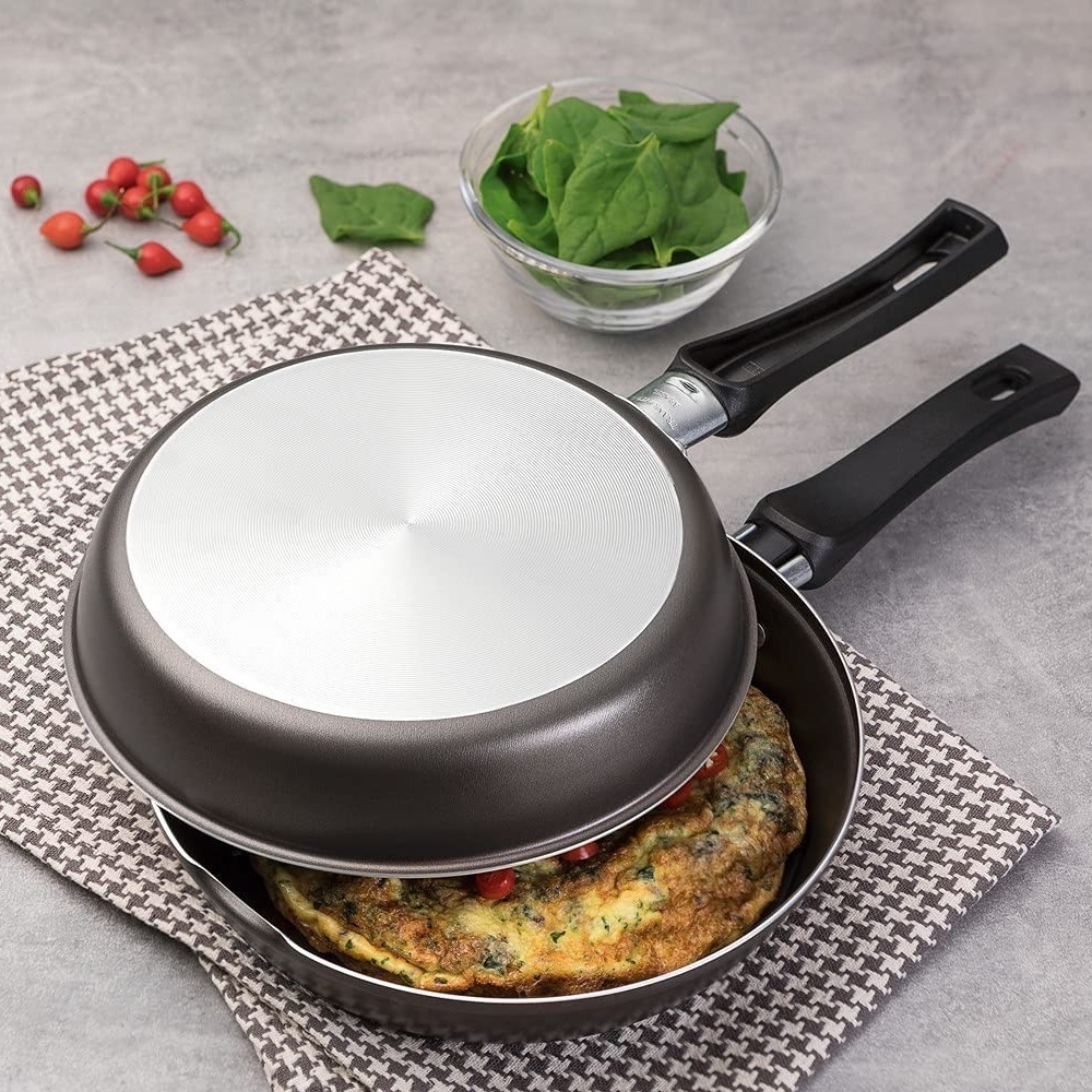伏せて重ねた2つのフライパンで、オムレツを綺麗に簡単にひっくり返せる優れもの。フライパンは外して別々に使用することもできます。