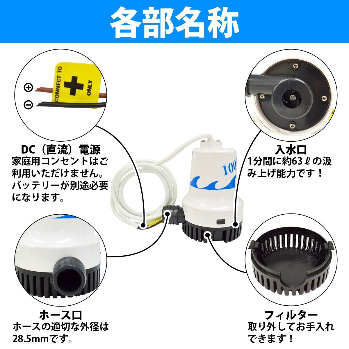 12V ビルジポンプ 1000GPH 海水 対応 毎分63L 水中ポンプ 船 ボート ヨット 船舶 雨水 浸水 排水 排水 汲み上げ ポンプ