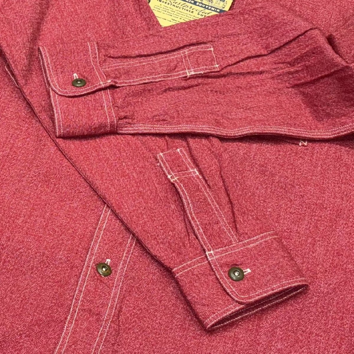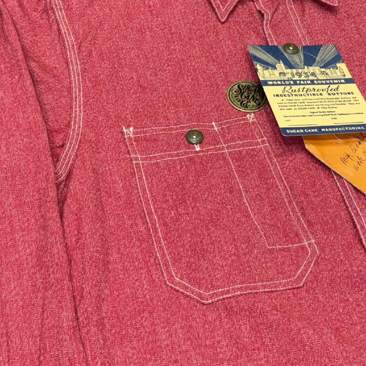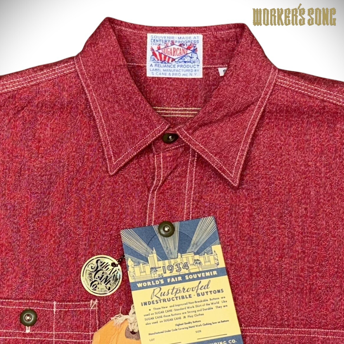 1933~1934年に開催されたシカゴ万博にて、シュガーケーンが参加していたら出品していたであろうと想定したワークシャツを製作。シャトル織機で織り上げた耳付きの杢生地やガチャポケ、85年の年月の経過により錆止めが剥がれ、錆びたボタン等、見どころ満載のシャツに仕上がった。