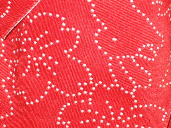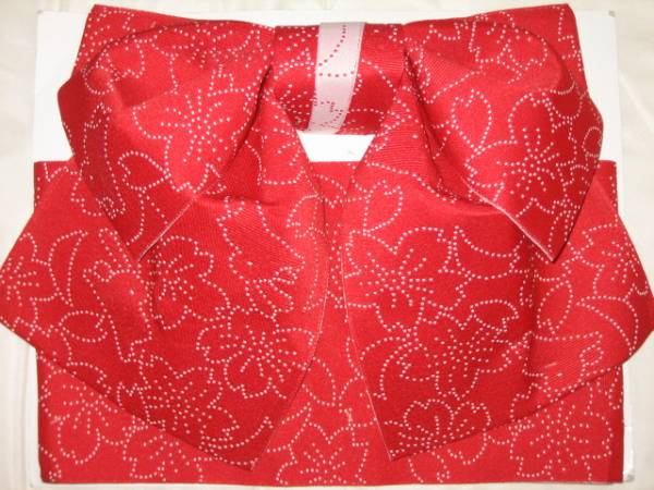 女性yukata用、地紋柄結び帯  赤 ポリエステル  新品(織り地紋柄ありです。波状の写りはレンズの光学的ないたずらで現品にはありません、また薄く濃く写っている場合もあります)、胴部--帯巾約17,0cmx長さ約130cm、リボン部は横に約30cm。見た範囲で汚れないと思いますが、着用に差し支えない薄汚れ(多分ない?)はあってものお値段で出品です。