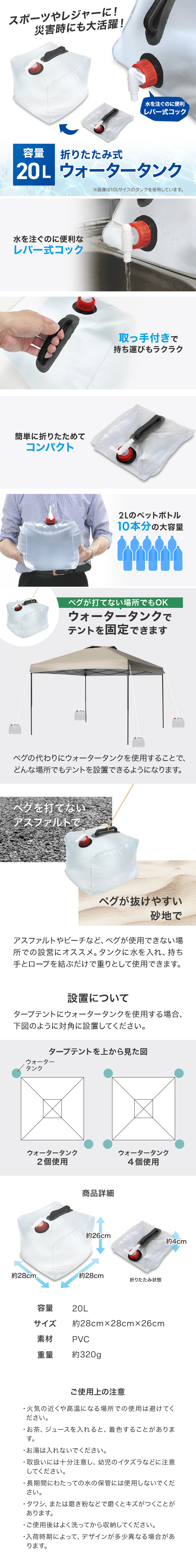 便利な蛇口ノズルが付いたウォータータンクです コックをひねると水を出すことができます 災害時用の備えとしてだけではなく、アウトドア、バーベキュー BBQ、海水浴などキャンプ用品にもお使いいただけます また、タープやテントの重りにも使えます 使わない時は、コンパクトに折りたたみも簡単! 非常時の備えとして収納の時も便利です! レジャー・スポーツ・アウトドアでも大活躍間違いなしです♪ 商品コード:HGB01200 ■商品仕様 容量:20L × 5個セット 使用時サイズ(約):幅28cm×奥行き28cm×高さ26cm 収納時サイズ(約):幅28cm×奥行き28cm×高さ4cm 重量(約):320g 材質:PVC 他 ■保障期間 7日間 ※商品到着後7日以内の初期不良・破損のみご対応させていただきます。 ■注意事項 ※本品は水専用のタンクとなります。ガソリン・石油・アルコール等は入れないでください。 ※火気の近くや高温になる場所での使用は避けてください。 ※お湯は入れないで下さい。 ※長期間にわたっての保管には使用しないでください。 ※たわし又は磨き粉で磨くとキズがつくことがあります。 ※ご使用後はよく洗ってから収納してください。 ※商品は、モニターによって色合いが異なって見える場合があります。 ※仕様・デザインは改良のため予告なく変更することがあります。 【もちろん新品未使用品です】 |