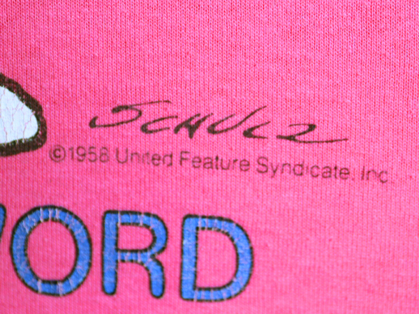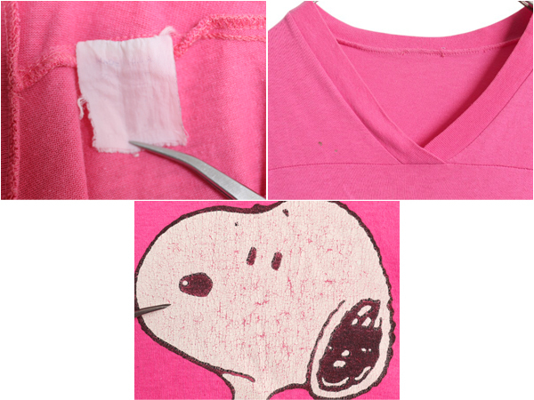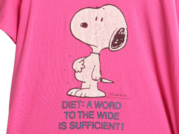 70-80年代のヴィンテージ スヌーピー プリント Tシャツです。 タグ欠損の為、詳細は不明ですが、 肌触りの良い着心地抜群の素材が使用されています。 1958 United Feature Syndicate. Inc. コピーライト入り オフィシャル コーディネート良いアクセントになるピンクボディ フロントに人気キャラクタースヌーピービックプリントと DIET: A WORD TO THE WIDE IS SUFFICIENT (ダイエット: 一言で十分である)の ジョーク メッセージプリント入り Vネック、肩を落としてざっくり着れる 人気のフットボールタイプ 着丈が長く Tシャツワンピース としても使える ゆったりとした人気のシルエット これだけで様になる商品です |