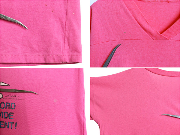 着用には全く問題ありません。 プリントに軽い剥がれ、 数箇所薄ヨゴレがあります。 気にならない程度です(写真参照) それ以外は、多少の使用感がある程度で 特に表記するところの無い非常に良い状態です。 |