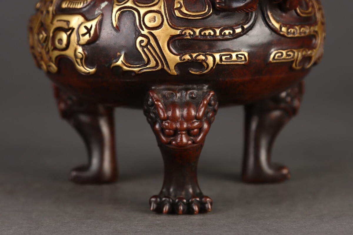 【瓏】古銅鏨刻彫 塗金饕餮紋魑龍耳香薰炉 明時代 宣徳年製 銅器 古美術 骨董品 香道具 蔵出