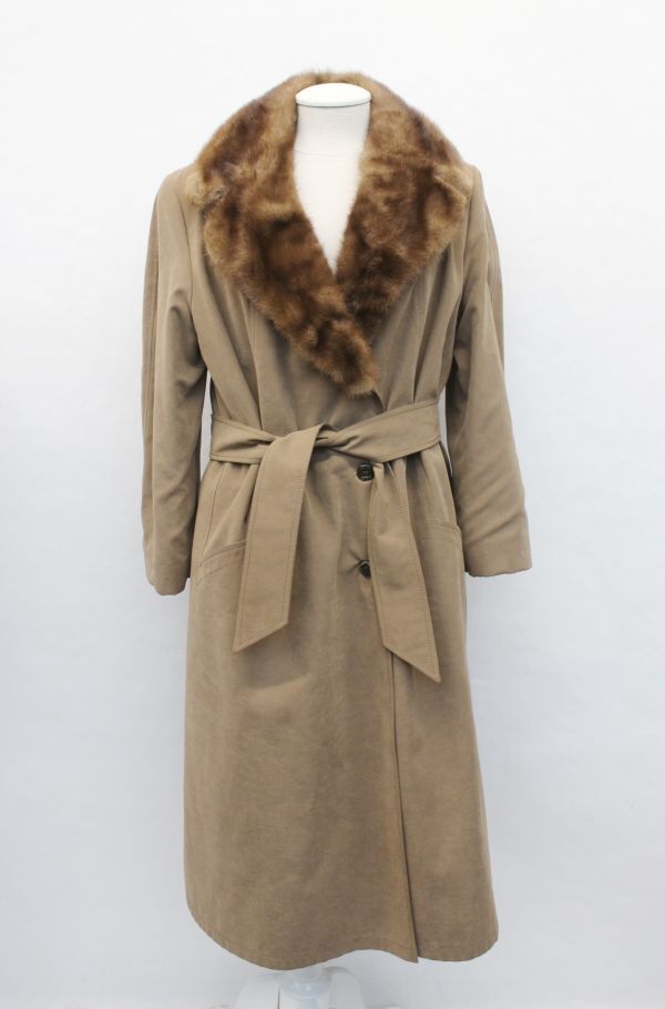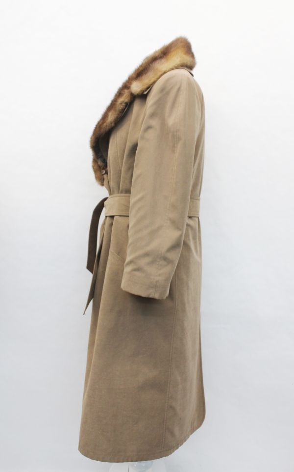 デミバフ・ミンク毛皮ファー・ライナーの付いたブラウンの布地コート。ミディアムブラウンの艶のある毛並み。ライナーは取り外し可能。ミンクファーのノッチカラー。ボタン留め。ベルトつき。