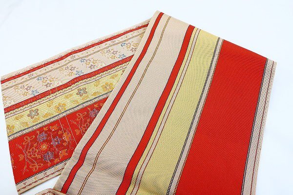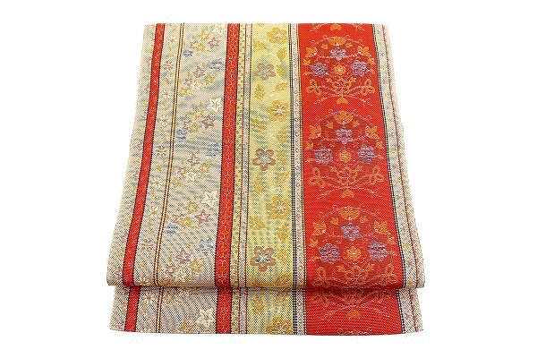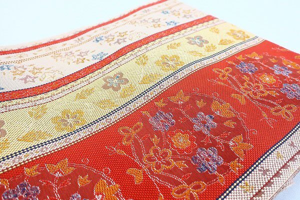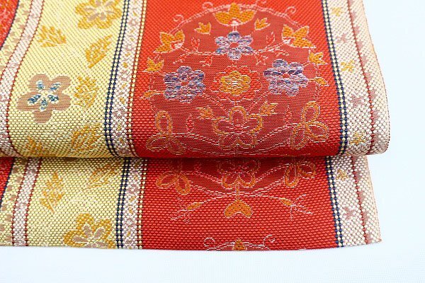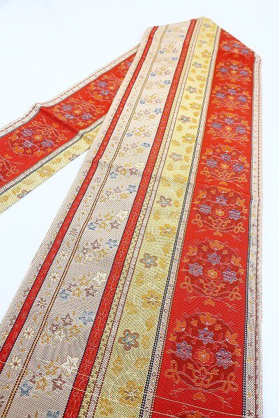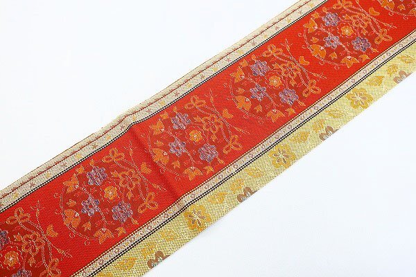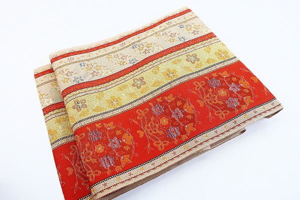 | 未使用品 名古屋帯 博多献上 博多織 唐草花 3m51cm オレンジ系 長さ3m51cm お洒落 普段着 正絹 着物フィ m-7697 |