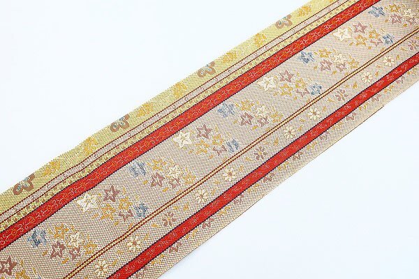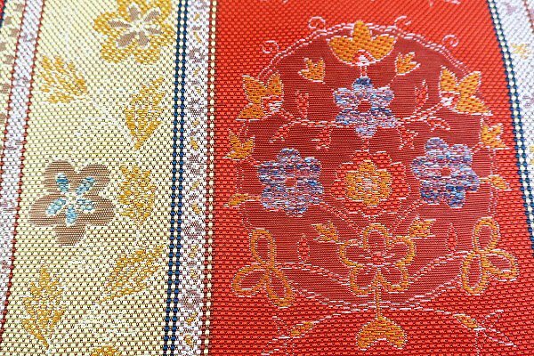 オレンジ系の地に唐草花文様があしらわれた、博多織りの名古屋帯です。 織りの風合いが素敵な一本です。 未使用品です。 担当:前田 |