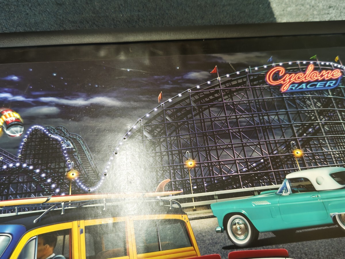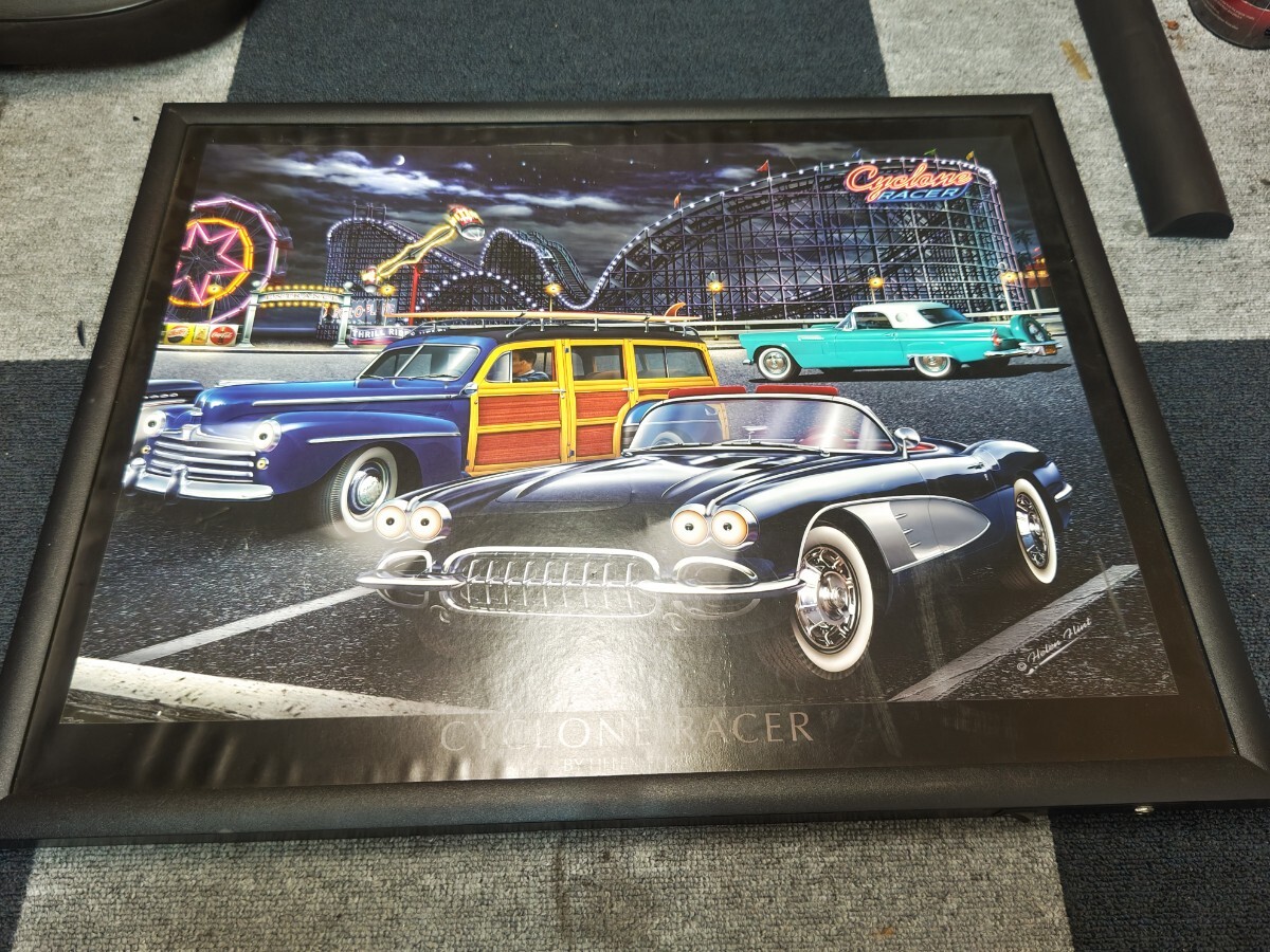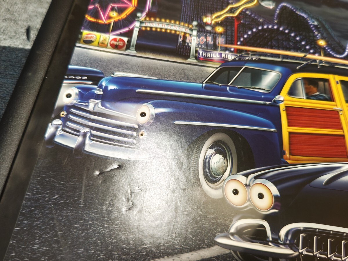 アメ車のプリントに本当はヘッドライトや看板部分が光るのですが、コードが無いので点灯確認出来ません。こんな物ですが何方か気に入った方いかがでしょうか?欠品していますので、ジャンク扱いでお願いします。NOクレームNOリターンでお願いします。