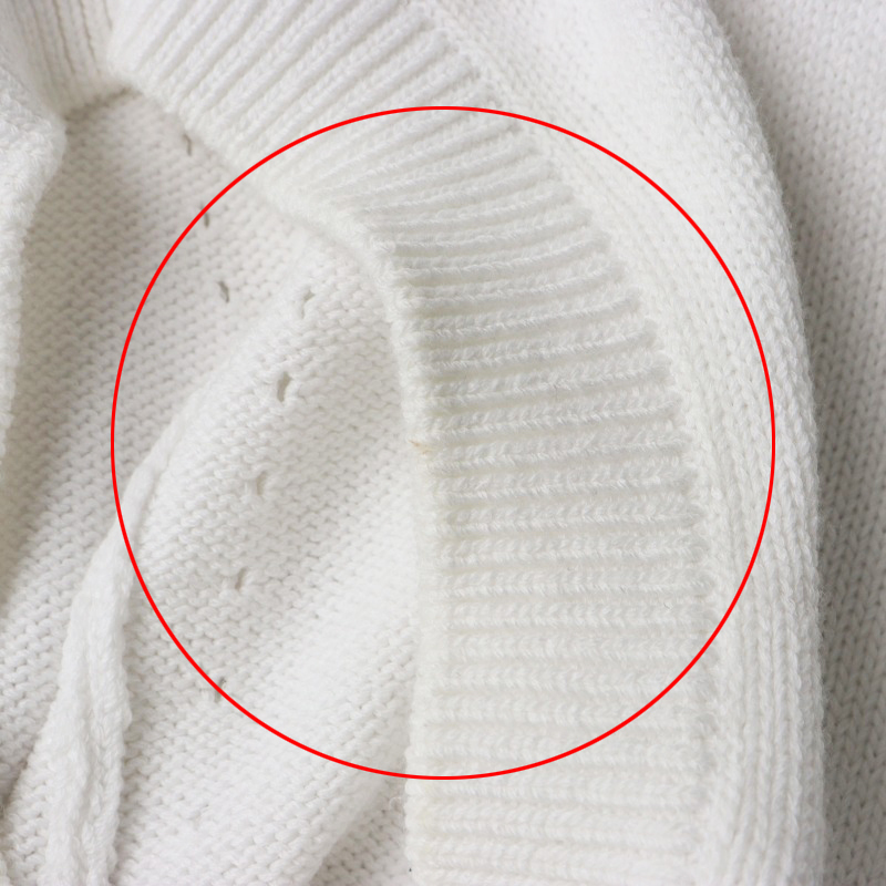 フード口にやや黄ばみ、袖口に若干小さい毛玉・薄い汚れ、両袖に極薄いシミが見受けられます。
