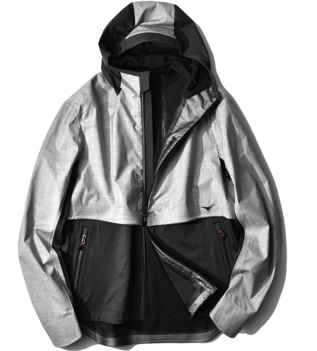 前身後切り替え部分、ジップ下のウィンドウストッパー、フードのヘム中央にはリフレクターを採用することで、