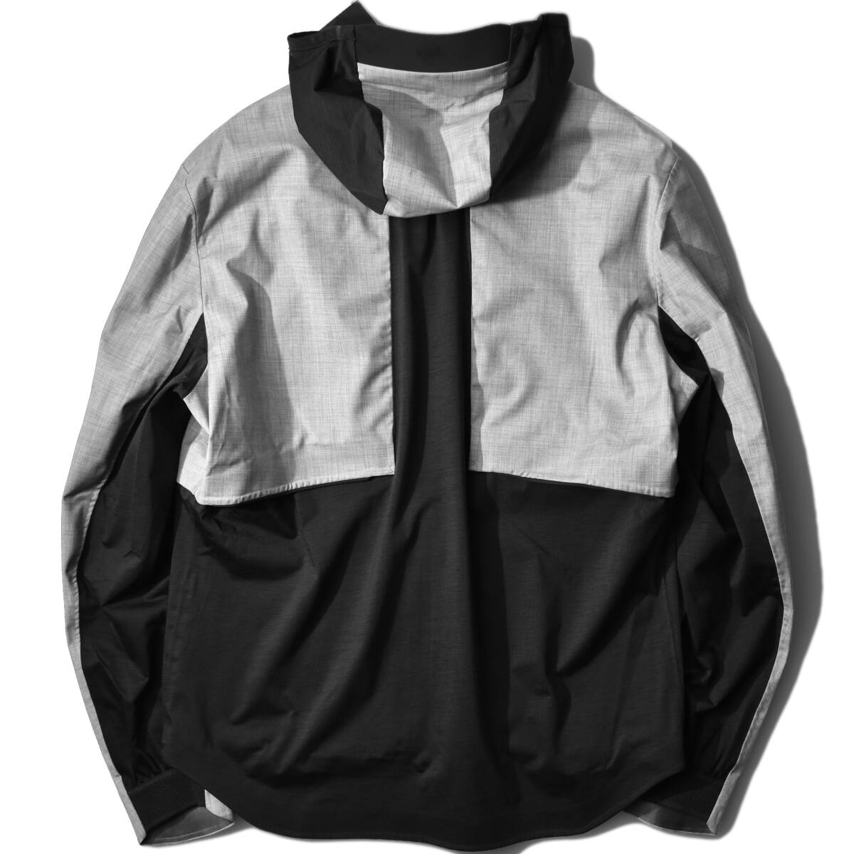 身頃のライトグレー生地部分は、トレンチコートでお馴染みのケープド・バック仕様になり、