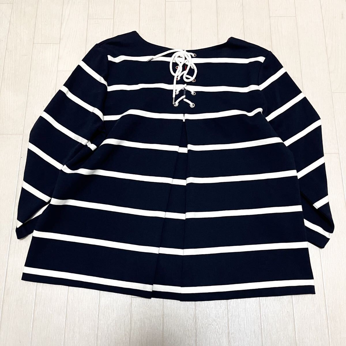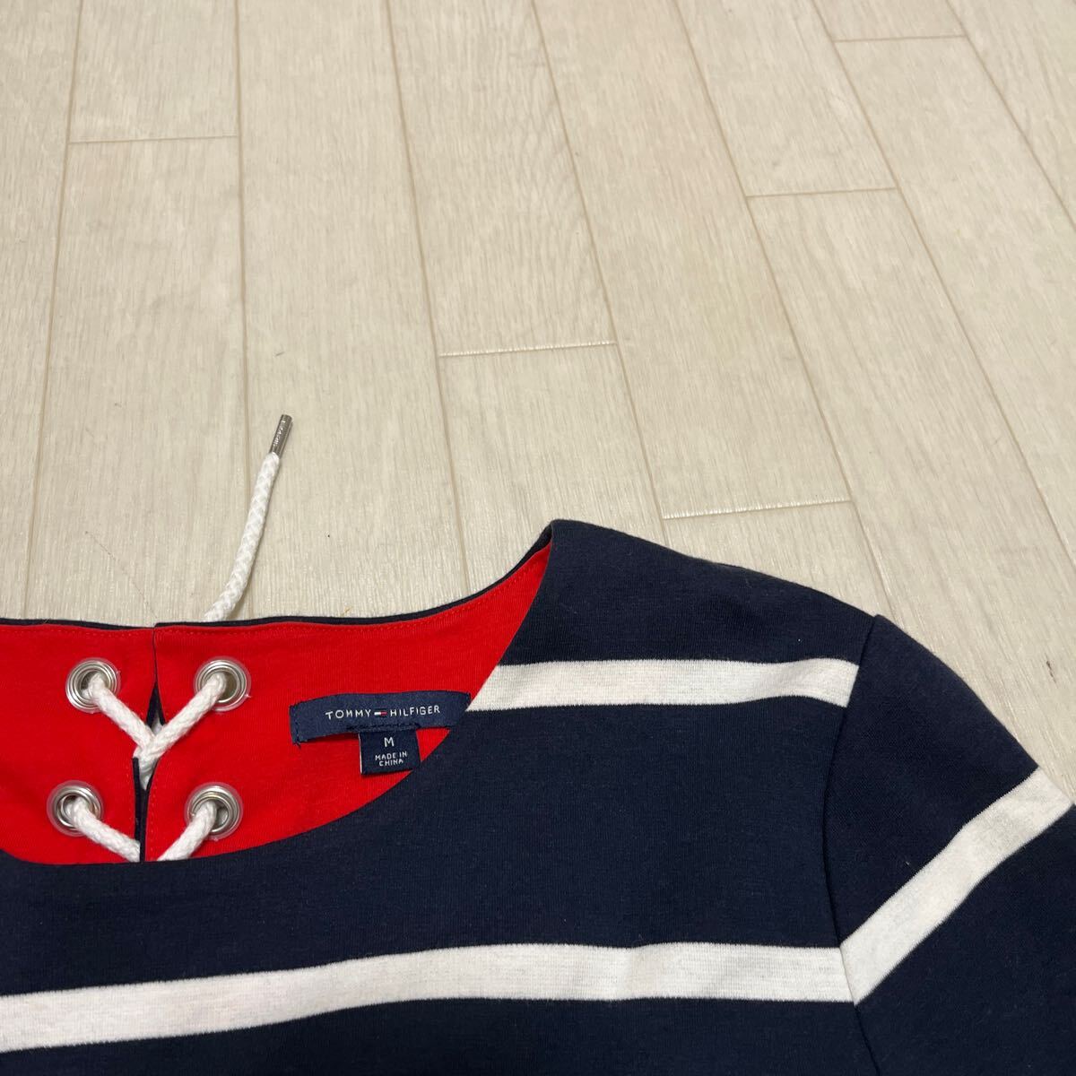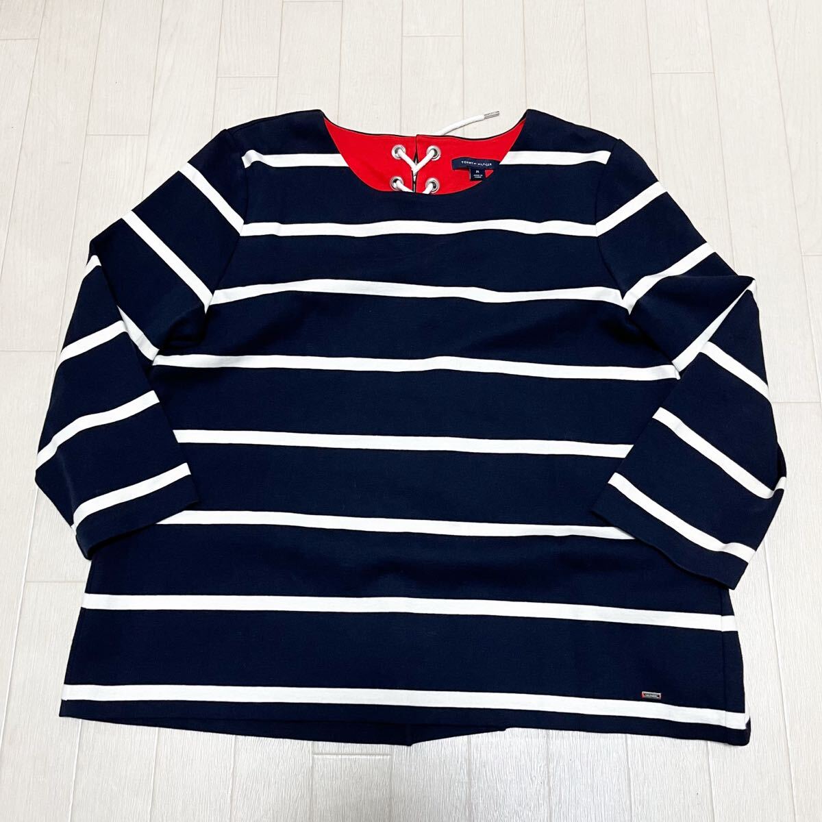 和732★ TOMMY HILFIGER トミーヒルフィガー ボーダー カットソー 九分袖ほど ボートネック M ネイビー ホワイト レディース