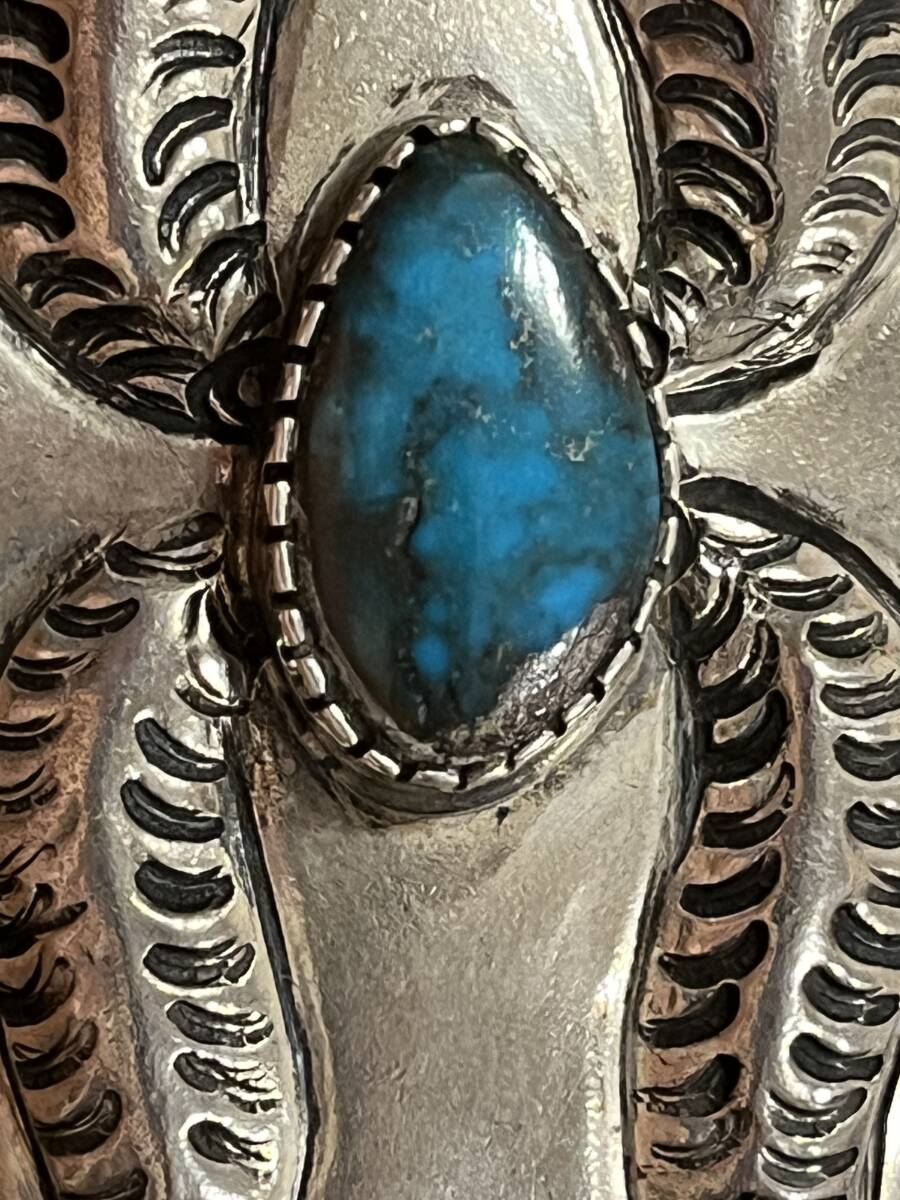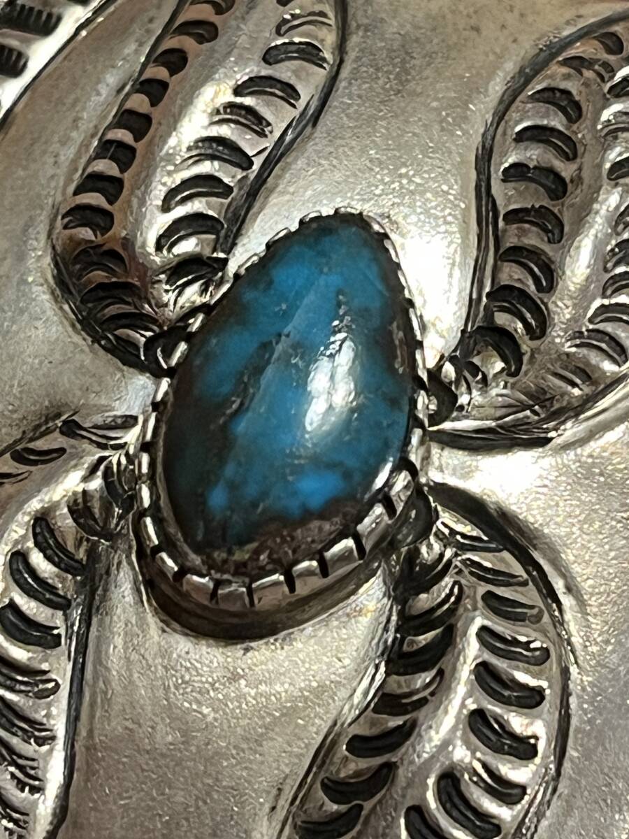 大阪の有名インディアンジュエリーショップで購入した作品で、装着されたターコイズはこのお店ではジェムグレードを謳うすばらしく美しい 9.4 カラットビズビーターコイズです。