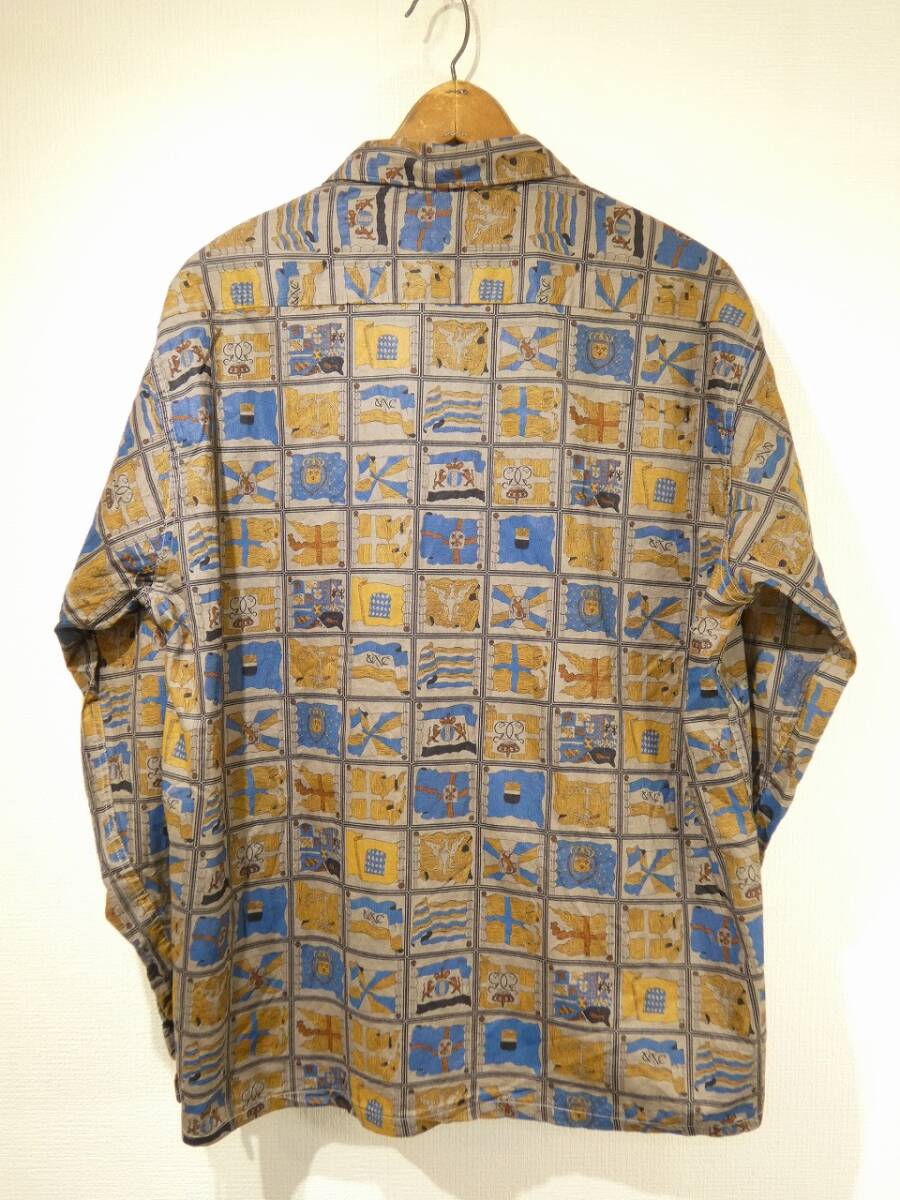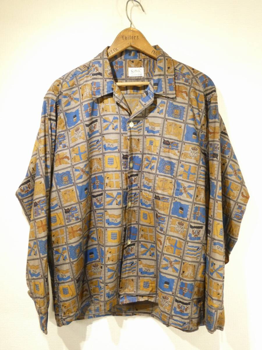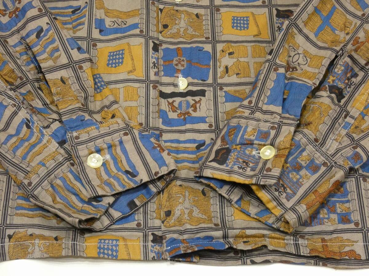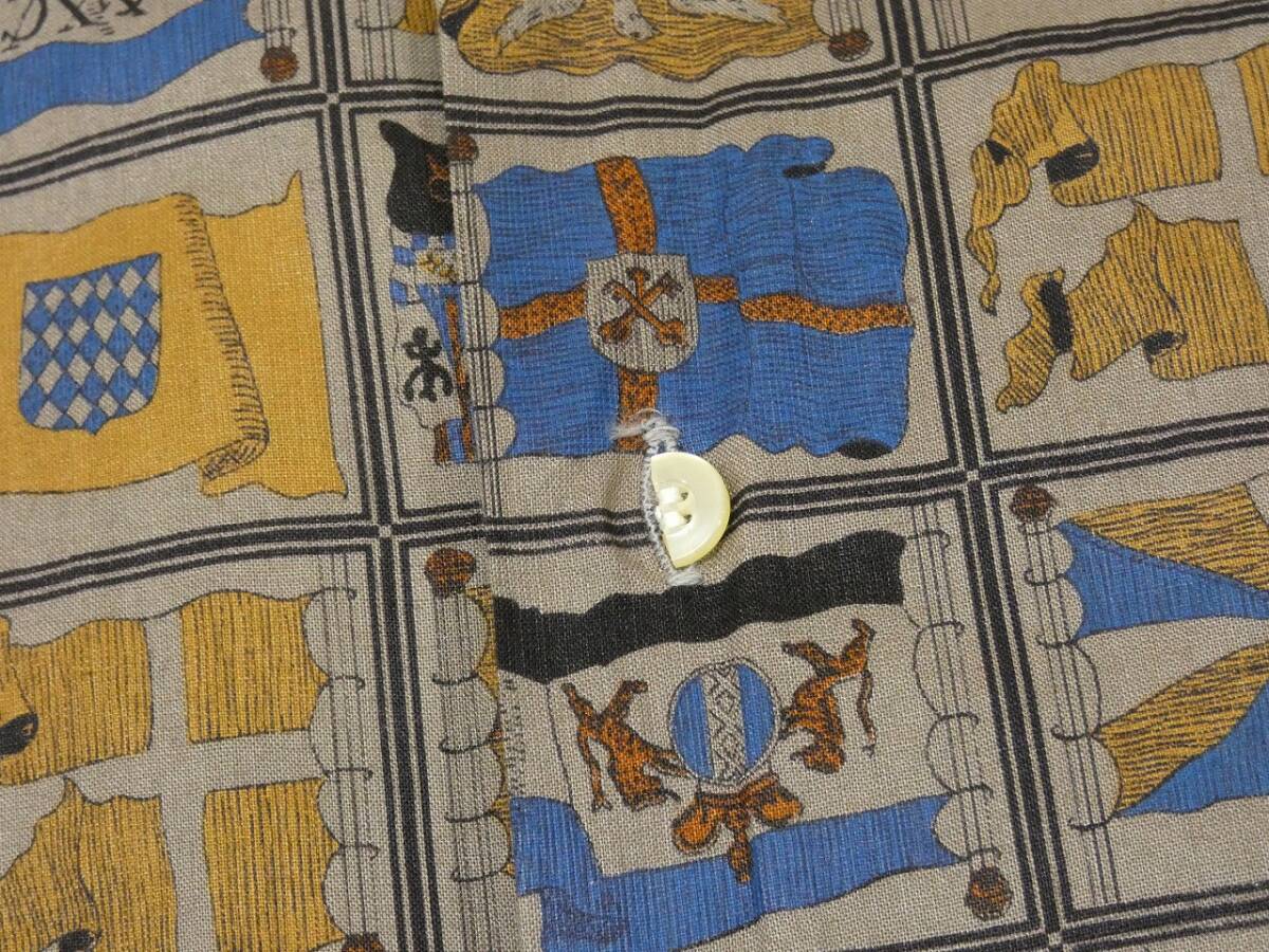 | こちらは、60年代頃のサットン 総柄 オープンカラー スクエア シャツになります。 襟はステッチと襟芯の入るオープンカラーで、中世ヨーロッパの国旗の様な柄がパネル状にプリントされてます。ロングスリーブの総柄シャツは小紋柄などが多く、この様な大柄の物は有りそうであまり無く珍しいと思います。アメリカでも本当に見かけなくなてきた大き目のスクエア(ボックス)シャツですので、お好きな方は是非、ご検討下さい。 コンディションは、第5ボタンに欠けが見られますが、状使用感少なく状態は良好です。 素材 COTTON SIZE L-16-16 1/2 肩幅50cm 身幅61cm 袖丈59cm 着丈70cm 素人採寸の為、多少の誤差はご了承ください。 | |||