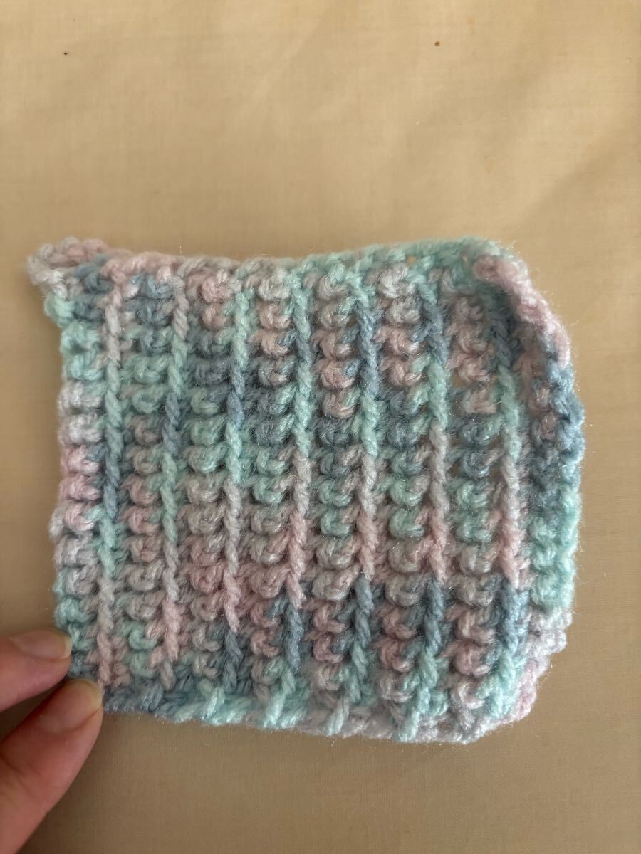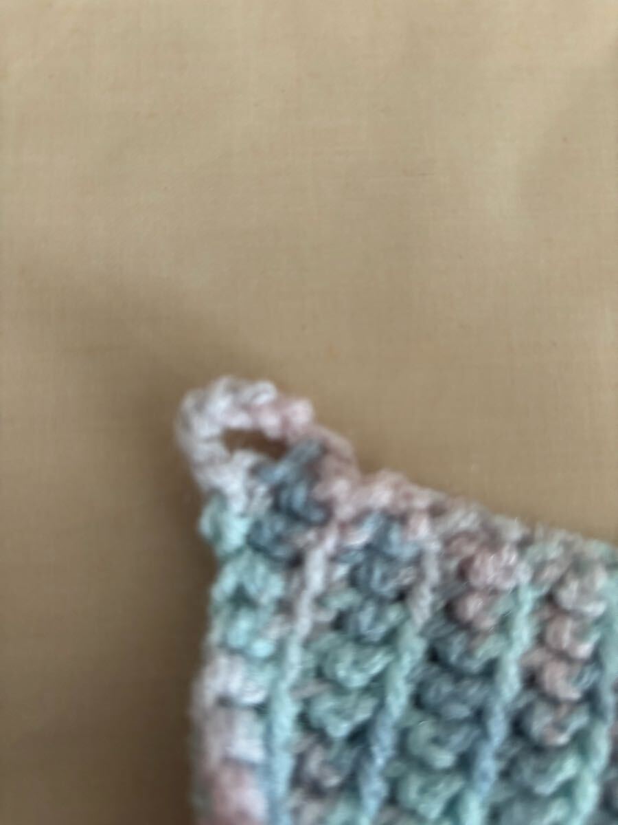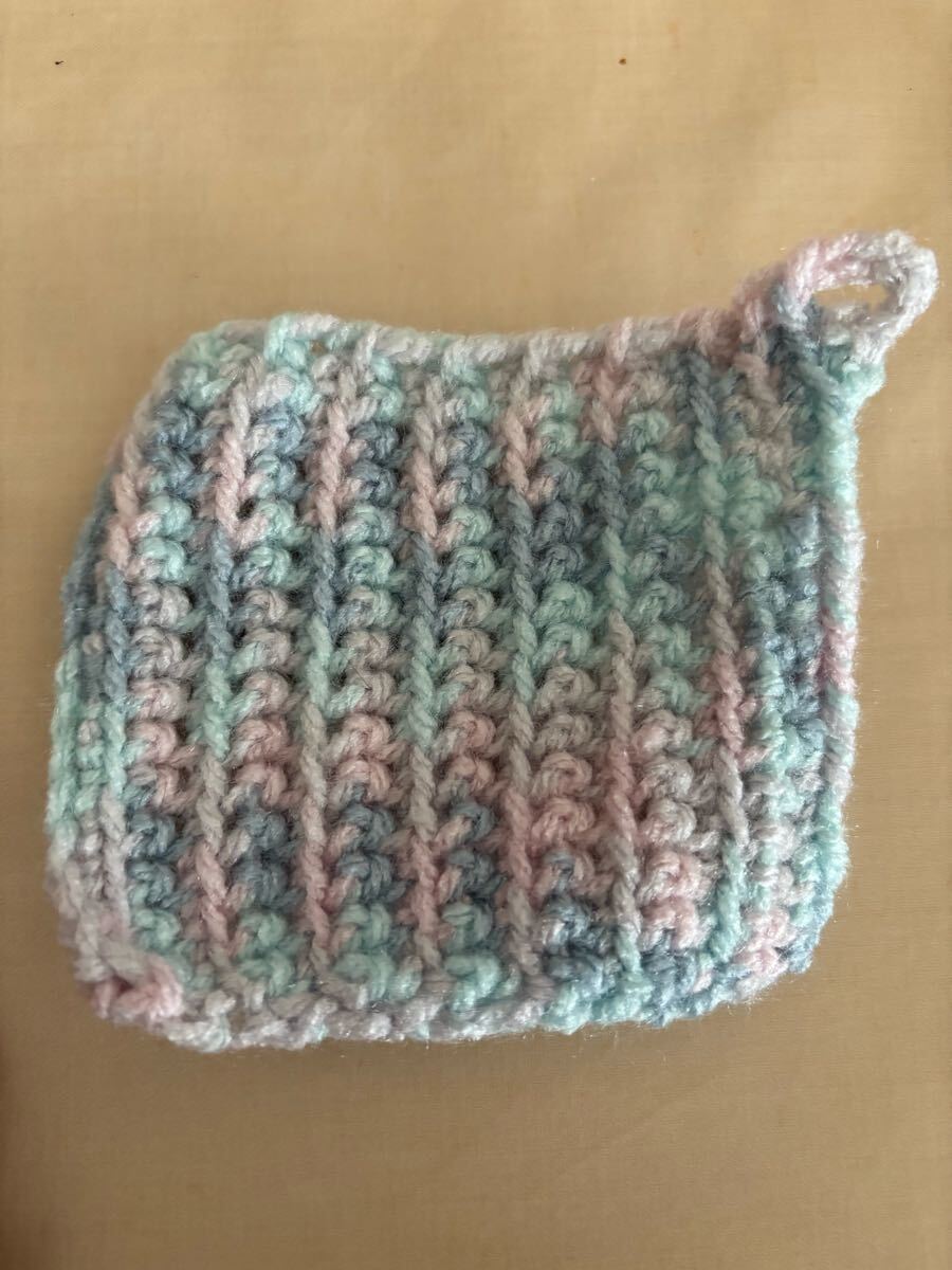 かぎ針編みの台所用スポンジ、青・ピンク・緑のグラデーション。