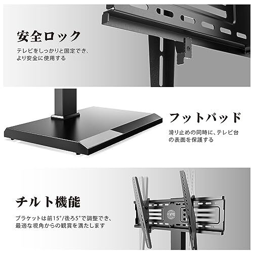 | 商品説明 | 【VESA規格対応】汎用性の高いVESA規格(テレビ背面のネジ穴間の距離)対応、最小限は10×10cm、最大限は60×40cmです。当製品が32~70インチのテレビやモニターに適応します。 【高さ調節可能】高さが支柱の取り付け位置により、4段階の高さ(1211mm~1361mm)を選択して取り付けることができます。 【ラック角度調節可能】左右方向へ±30°回転することができ、また、ブラケットは前15°/後ろ5°で調整できるので、リビングルームだけでなく、キッチンや寝室に居ても、最適な調整角度で調整し、いろんな視角からの観賞を満たします。 【安全素材・取付簡単】冷間圧延鉄素材、丈夫で耐震性もあり、テレビが倒れる心配がなく安心です。また、取付必要な部品が揃っていて、取扱説明書も付属され、取付は簡単です。 【品質保証】当社はいつもお客様の買い物体験と商品の品質を一番大事にしております。ご使用中、この商品について何かご問題点がございましたら、ぜひご遠慮なくこちらにご連絡ください。24時間以内でご返信いたします、無料交換または全額返金などの対応します。