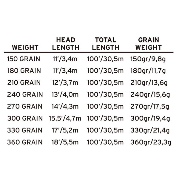 150gr.(9.8g) /11'(3.4m)/100'(30.5m) 180gr.(11.7g)/11'(3.4m)/100'(30.5m) 210gr.(13.6g)/12'(3.7m)/100'(30.5m) 240gr.(15.6g)/13'(6.7m)/100'(30.5m) 270gr.(17.5g)/14'(6.7m)/100'(30.5m) 300gr.(19.4g)/15.5'(7.3m)/100'(30.5m) 330gr.(21.4g)/17'(7.6m)/100'(30.5m) 360gr.(23.3g)/18'(7.6m)/100'(30.5m) |