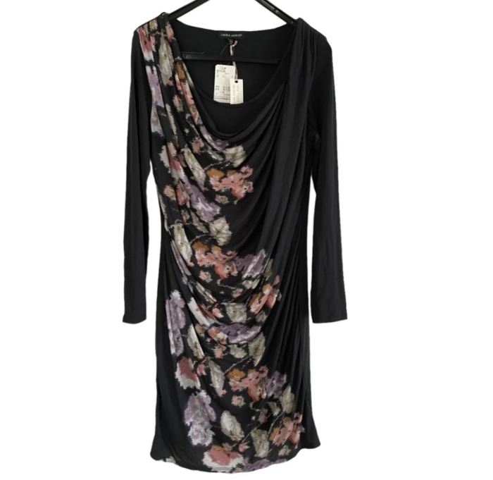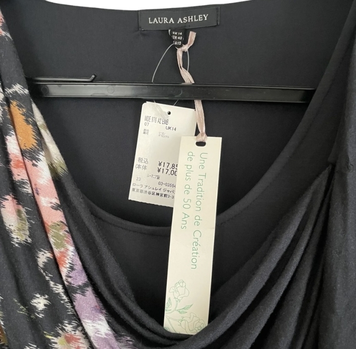 商品名 → タグ付き 未使用 ローラアシュレイ LAURA ASHLEY ワンピース 長袖 ロング フレア 花柄 UK14 ブラック 黒 MO93 レディース