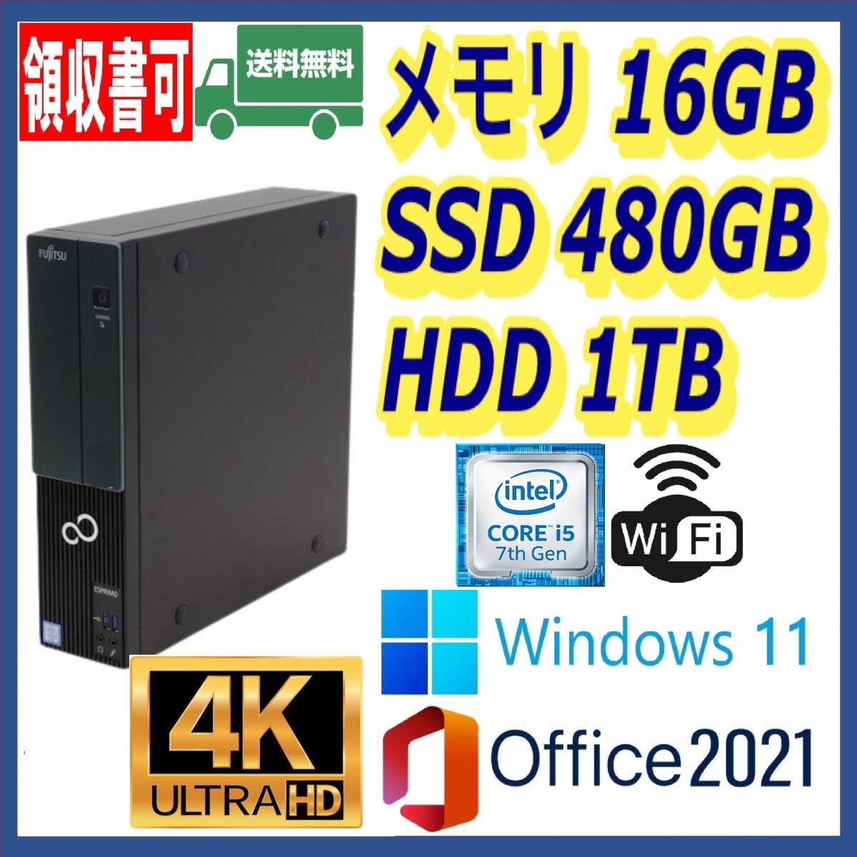 4K出力 超高速Intel Core i5-7500 高速起動新品SSD480GB 大容量HDD1TB(1000GB) 大容量メモリ16GB(DDR4) 高速USB3.0 DVDマルチドライブ 無線LAN (Wi-Fi) DVI接続 HDMI接続可能(オプション) マルチモニター対応 最新Windows 11 Pro 64bit DtoDリカバリ Microsoft Office 2021 |