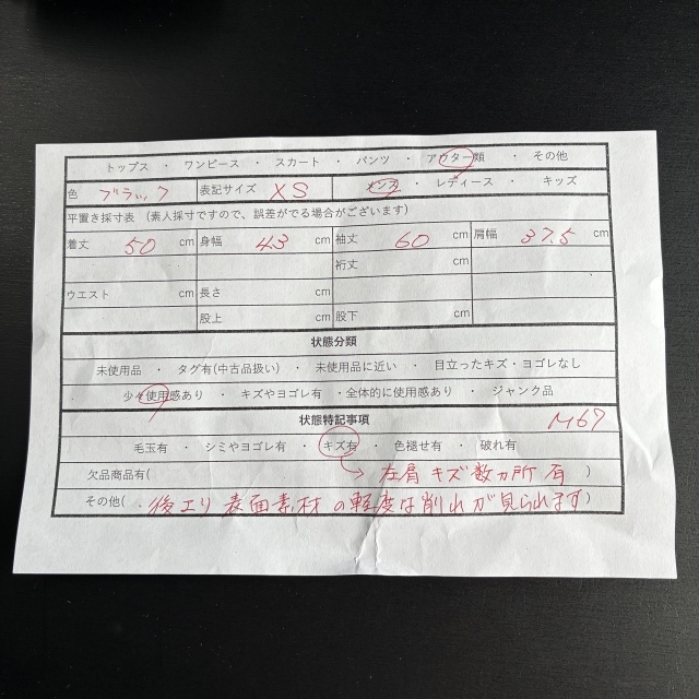 ・その他(左肩キズ数か所有、後エリ表面素材の軽度な剥がれが見られます)