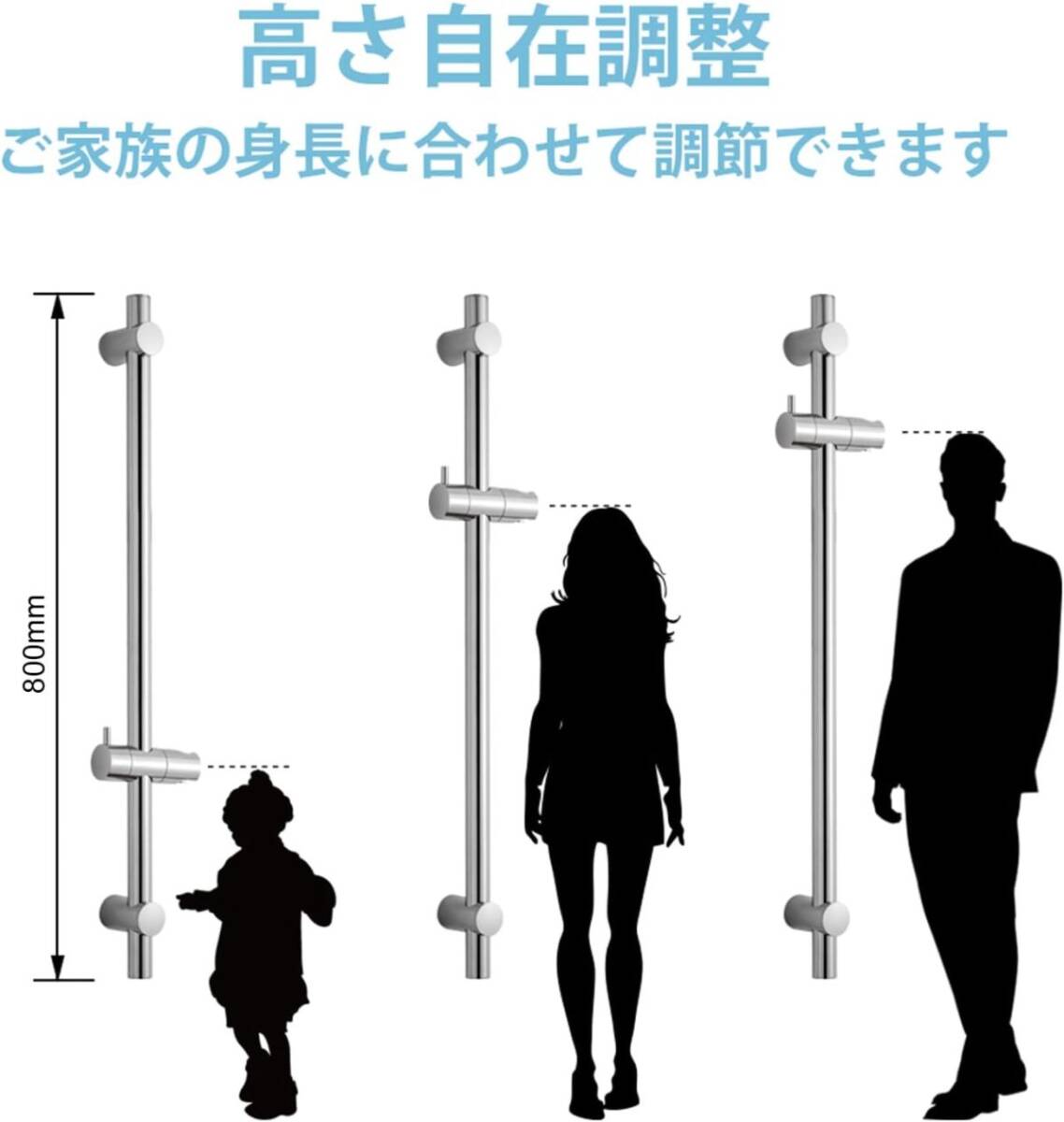 • [高さ調整 角度調整] スライドバーの長さは800mmあります。フックを上下スライドさせてシャワーヘッドの高さを調整可能です。フックを回して散水角度を360°調整可能です。家族様々に快適なバスタイムを作り上げます。