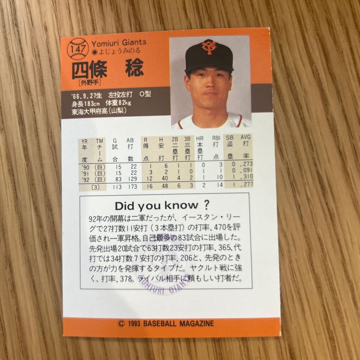 1993BBM 147 四條稔 読売ジャイアンツ