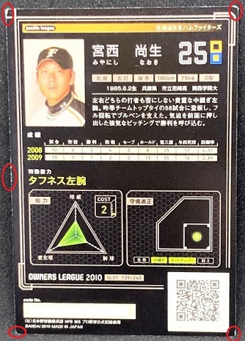 オークションサイトで購入した時点で、カード裏面に傷(画像2枚目の赤丸印)がございました。光の加減でわかりにくいかもしれませんが、特に、4つの角(特に左上)の傷は目立ちます。 それ以外は、比較的綺麗なほうだと思います(あくまで主観です)。 自宅保存しておりましたので、その辺をご考慮していただきたく思います。 | ||||