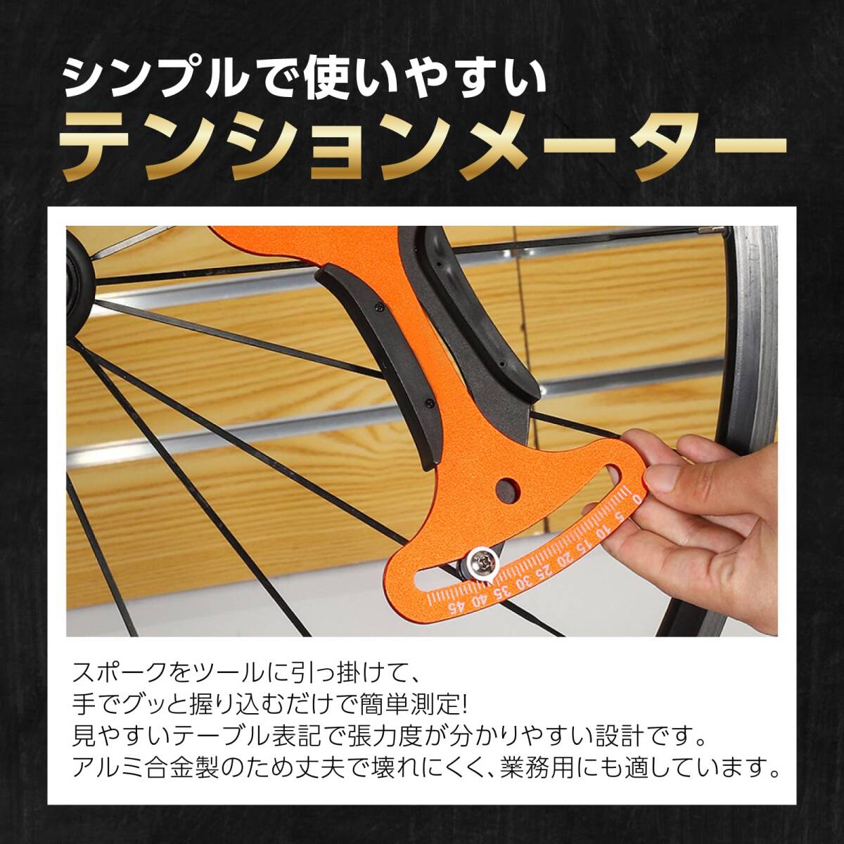 商品説明 | 自転車のメンテナンスに!ホイールスポークの張力を測るテンションメーターツール&テンションを調節するスポークレンチ&スポークの太さを測るスポークゲージの3点セットです。セルフメンテナンスに必要なツールがまとめてそろう♪すぐに使える嬉しいセット! 【シンプルで使いやすいテンションメーター】スポークをツールに引っ掛けて、手でグッと握り込むだけで簡単測定!見やすいテーブル表記で張力度が分かりやすい設計です。アルミ合金製のため丈夫で壊れにくく、業務用にも適しています。 【マルチタイプなスポークレンチ】一般的なスポークヘッドのサイズに対応したニップル回し。滑り止め加工がされており、作業時も手から滑り落ちることなく簡単にニップルを締めることができます。コンパクトで持ち歩きやすく、いつでも手軽にメンテナンス可能! 【ギフトにも最適!】ロードバイクやマウンテンバイク、クロスバイクなどさまざまなタイプの自転車にお使いいただくことができます。定期点検やセルフメンテナンスの必需品!サイクリングや通学・通勤で自転車に乗る方へのプレゼントとしても喜ばれること間違いなし♪ ※取扱説明書は付属しておりません。【商品内容】スポークテンションメーターセット【セット内容】スポークテンションメーター/スポークレンチ/スポークゲージ※モニターの環境により、色の見え方に若干差が生じる場合がございます。