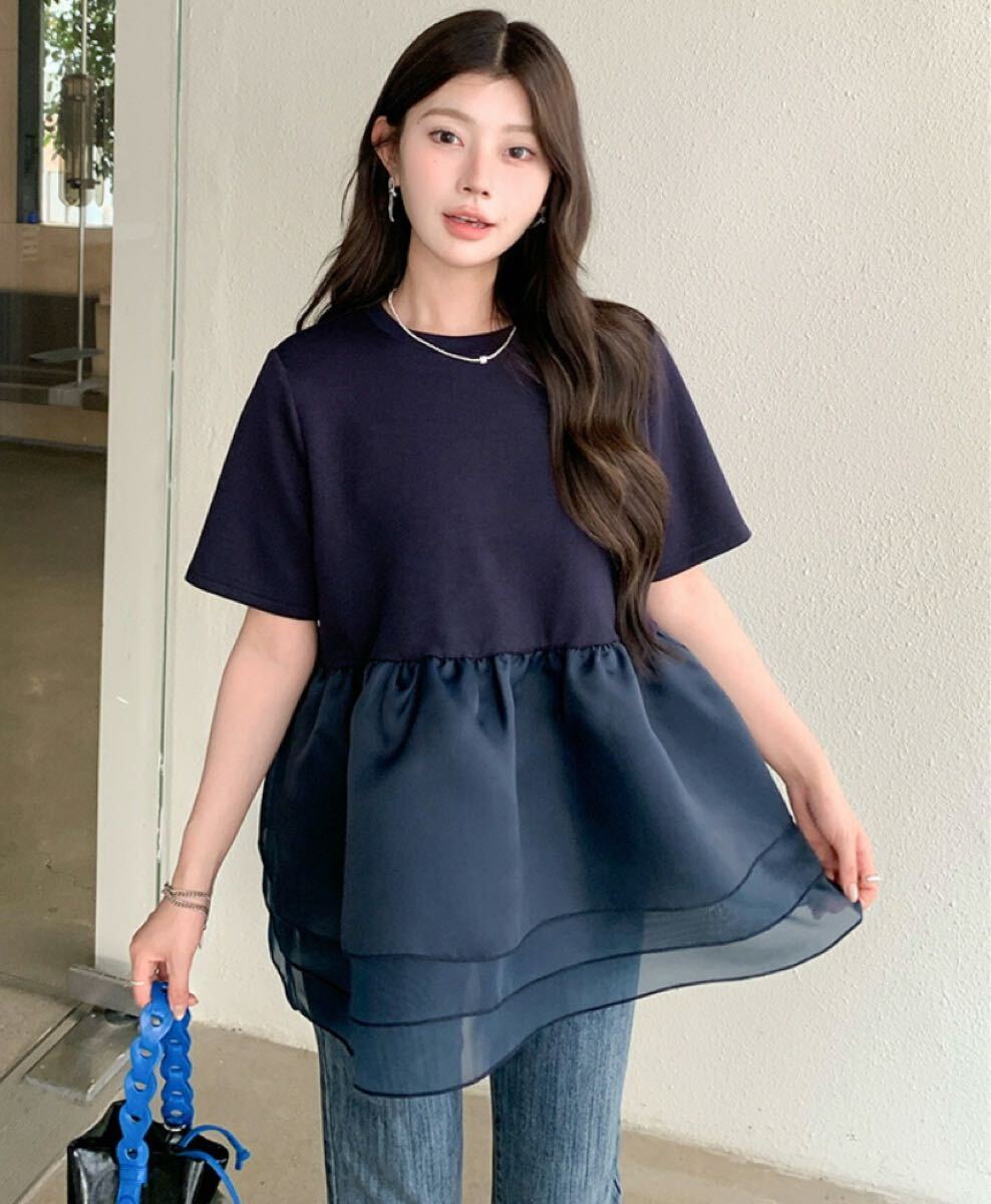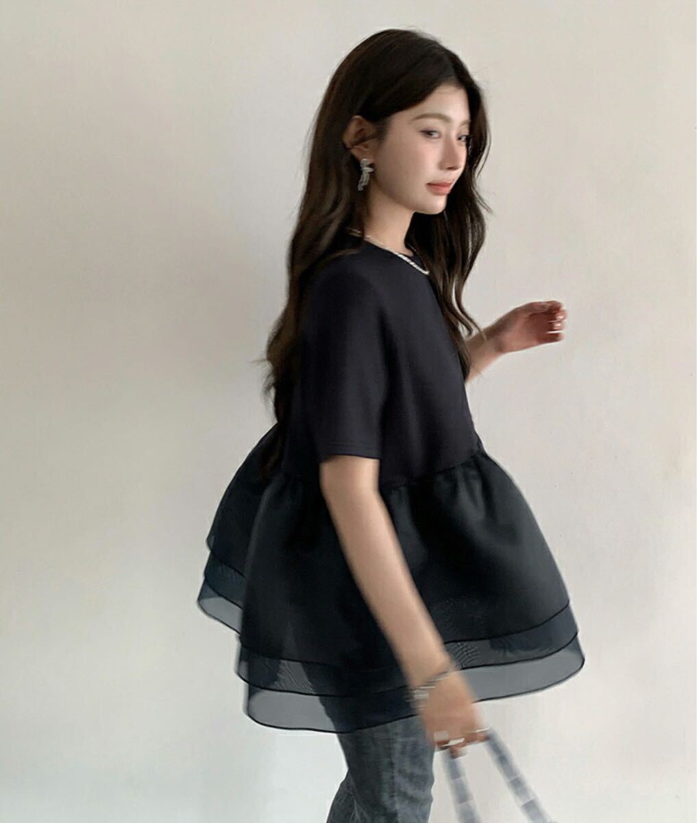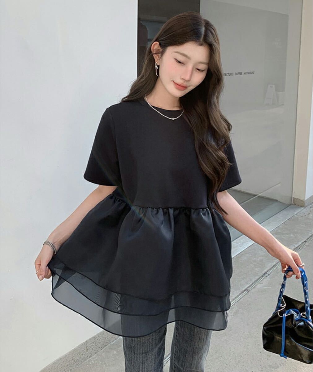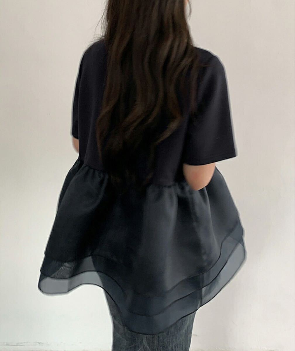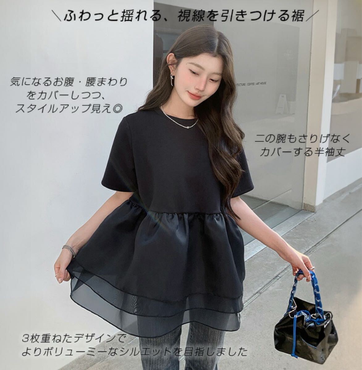 シアーフリル ティアード ペプラム ドッキングトップス 半袖 レディース ブラウス トップス Tシャツ Tブラウス 大人 オケージョン キレイめ 上品 ガーリー 白 夏 春 新作 体型カバー
