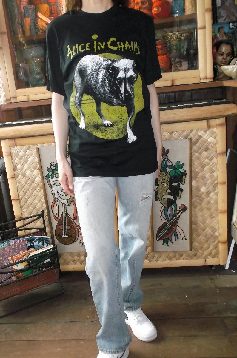 正規品 1987年にアメリカはシアトルで結成され、ニルヴァーナ、パール・ジャムらと共に、 グランジ/オルタナティブ ムーブメントの担い手として支持される「アリス・イン・チェインズ」のTシャツ「TRIPOD 」です。 95年リリース、トリプル・プラチナムを獲得した4thアルバム「ALICE IN CHAINS」のジャケット、 キニーをしょっちゅう追い回していた獰猛な3本足の犬「Triopod(※3本足の意)」をフィーチャリング, アルバムリリース時に日本では自主規制となったカバーアート!! 正規品・新品 Mサイズ 170cm~175cm位の方によいかと思われます。肩幅44cm, 身幅48cm, 着丈73cm モデル 161cm , Sサイズ着用 郵メール便送料¥250(代引き不可・紛失補償なし) ACE CAFE LONDON、LUCKY13、MOONEYES、Sailor Jerry等~アメキャラ・企業ロゴ等ライセンスTシャツ、RATFINK関連品、バンドTシャツ、等取り扱っております。 ** 他にも色々出品中です。 CWBT cwktw cwlpm IWTS | |||||||