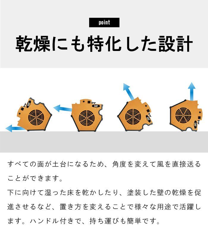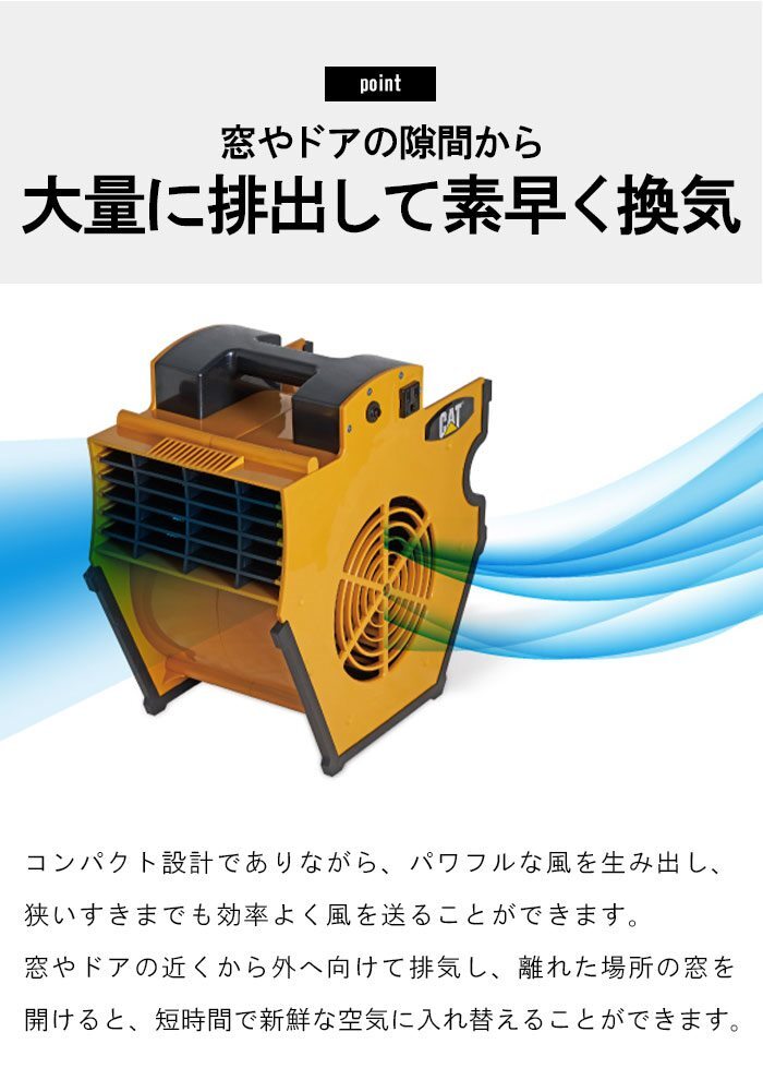 窓やドアの隙間から大量に排出して素早く換気。 乾燥にも特化した設計。 3台まで連結可能。 コンパクト設計でありながら、パワフルな風を生み出し、狭いすきまでも効率よく風を送ることができます。 窓やドアの近くから外へ向けて排気し、離れた場所の窓を開けると、短時間で新鮮な空気に入れ替えることができます。 すべての面が土台になるため、角度を変えて風を直接送ることができます。 下に向けて湿った床を乾かしたり、塗装した壁の乾燥を促進させるなど、置き方を変えることで様々な用途で活躍します。 ハンドル付きで、持ち運びも簡単です。 本体に連結用コンセントが付いてるので、電源タップが無くても連結可能できます。 |