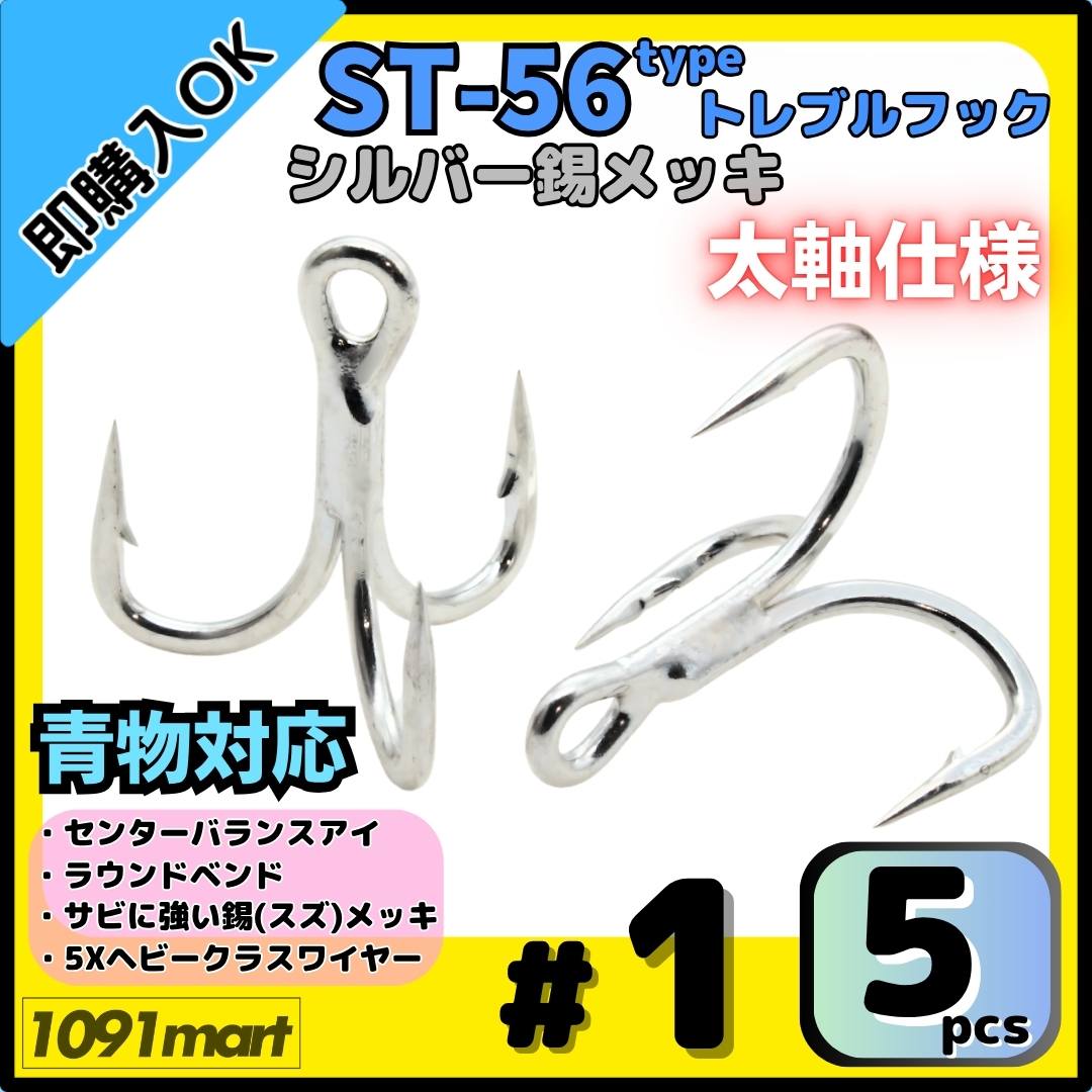 【送料無料】ST-56タイプ 防錆トレブルフック #1 シルバー 5本セット 太軸 5Xワイヤー使用 大物 青物対応 ヘビークラストリプルフック