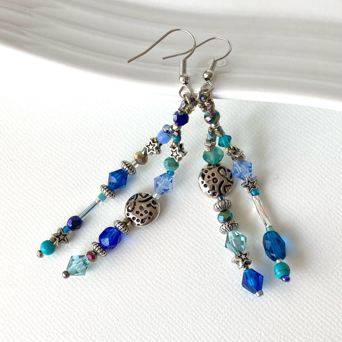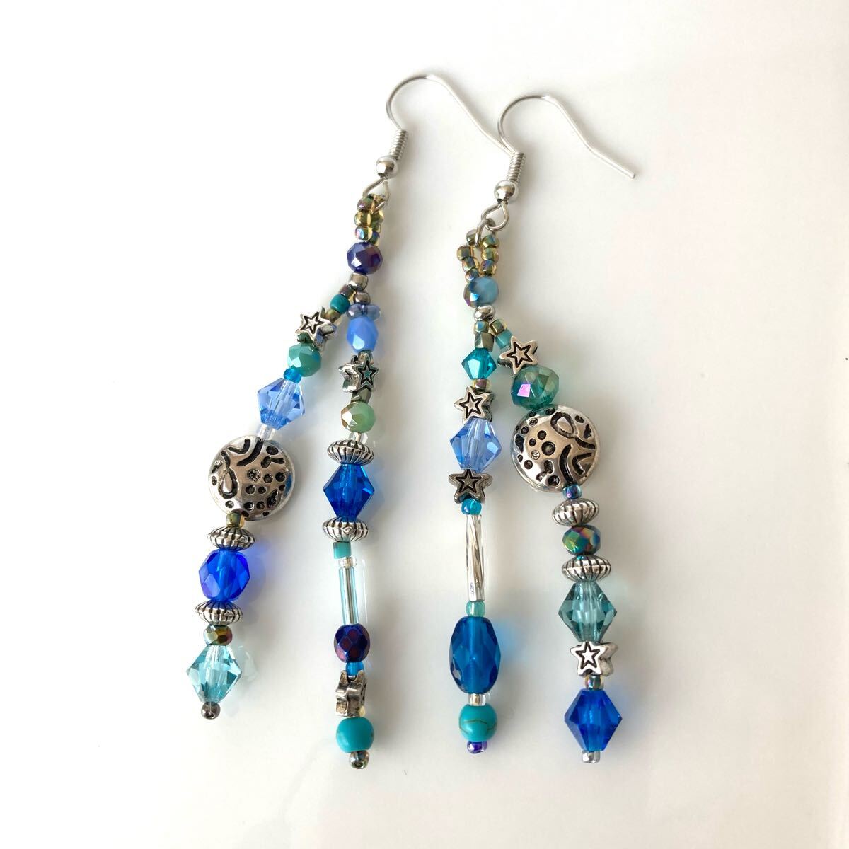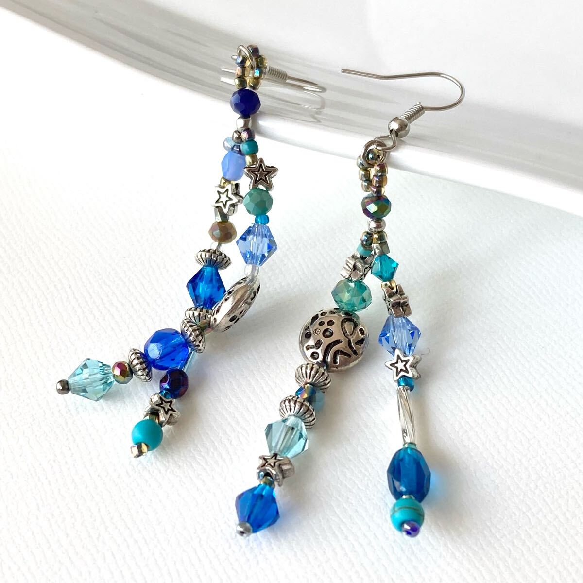ブルー、ターコイズカラーのいろいろなビーズ、シルバーカラーの丸型、小さい星等のメタルビーズで作ったピアスです。