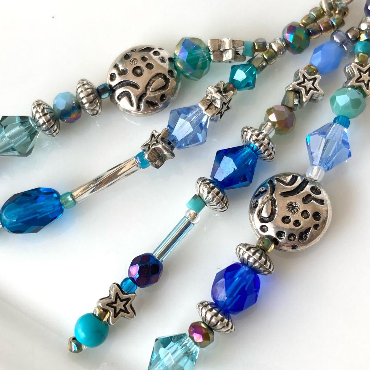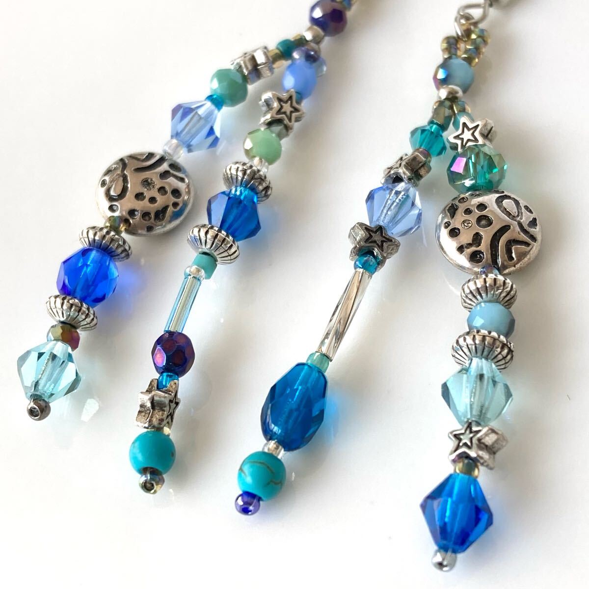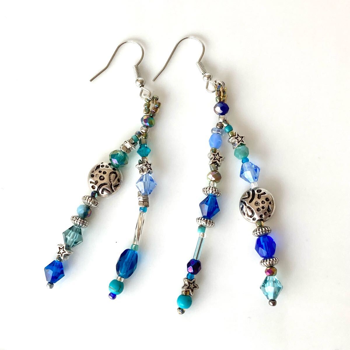 ブルー、ターコイズカラーのいろいろなビーズ、シルバーカラーの丸型、小さい星等のメタルビーズで作ったピアスです。