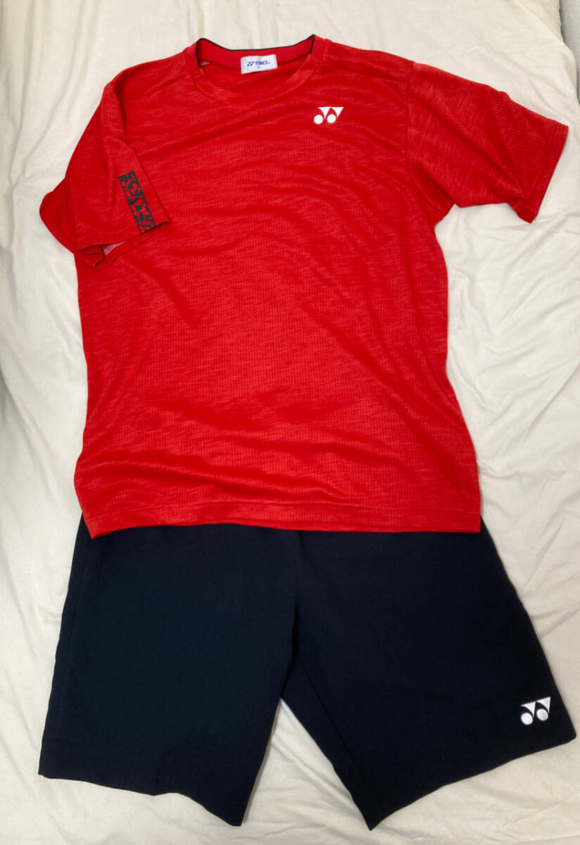 ヨネックス メンズテニス ゲームシャツ サンセットレッド 10304 496 &ユニハーフパンツ スリムフィット 15048 Mサイズ上下セット!美品 YONEX