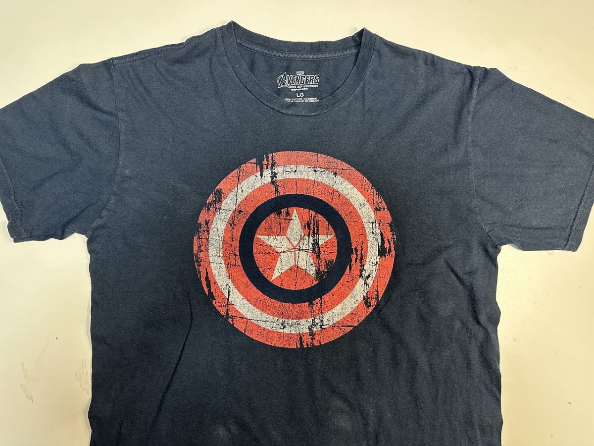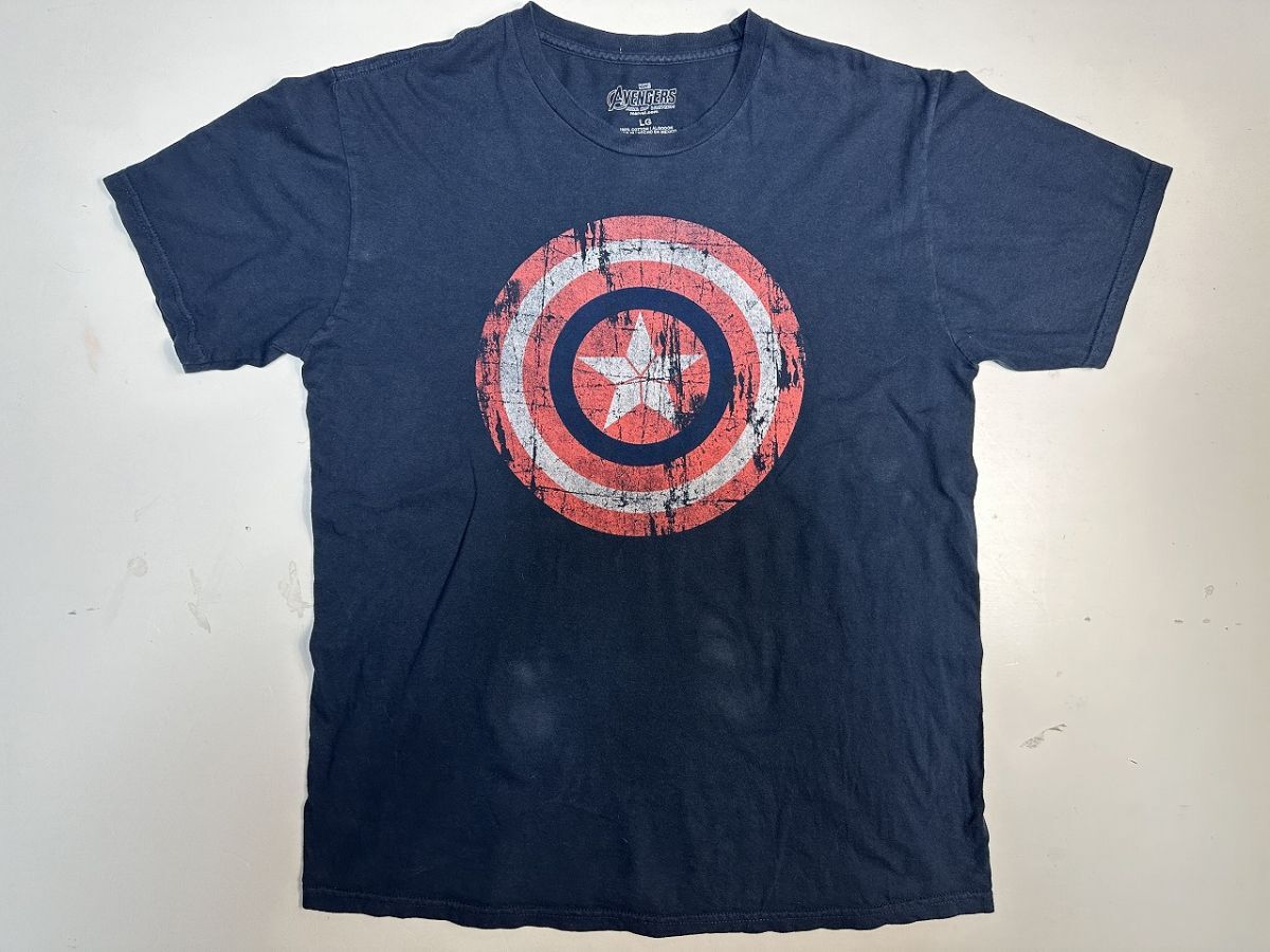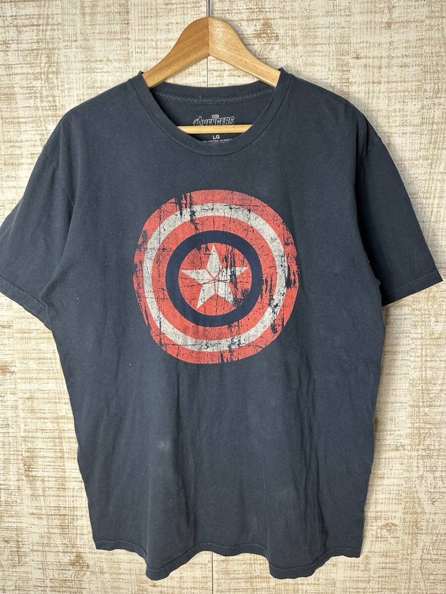 ●US USED AVENGERS アベンジャーズ アニメ MOVE Tシャツ キャプテンアメリカ マーク プリント ネイビー紺【L】コットン
